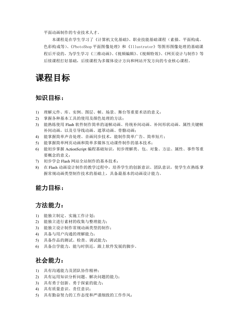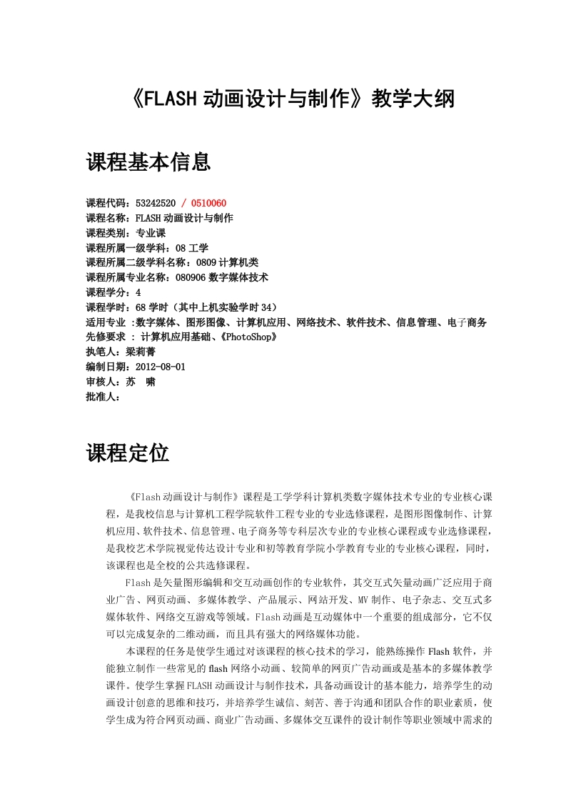 FLASH动画设计与制作教学大纲2014版348072@abc昨天发布关注私信0.13MB13页031FLASH动画设计与制作教学大纲2014版此内容为付费资源,请付费后查看¥9¥19黄金会员免费钻石会员免费立即购买您当前未登录!建议登陆后购买,可保存购买订单付费资源 第1页 / 共13页 第2页 / 共13页 第3页 / 共13页 试读已结束,还剩10页,您可下载完整版后进行离线阅读 THE END网站设计高考真题 文本预览 《FLASH动画设计与制作》教学大纲编者:梁莉菁审核人:苏啸课程负责人:梁莉菁教研室:图形图像教研室编制单位:信息与计算机工程学院编制日期:2012年9月1日修订日期:2014年9月1日萍乡高等专科学校教务处2012年9月1日 查看更多 收起部分 喜欢就支持一下吧收藏
