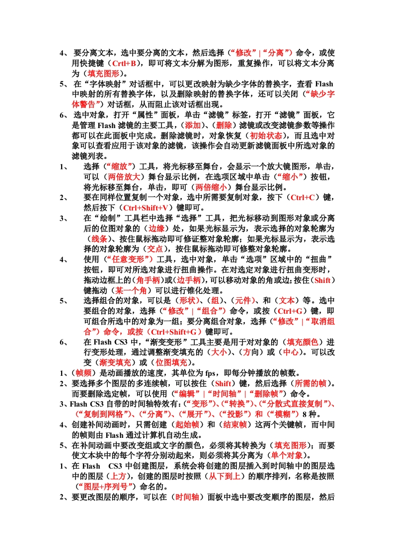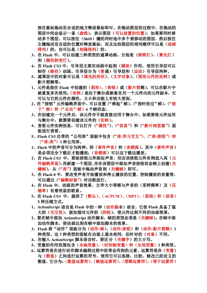 Flash动画设计制作复习题05填空题第一章1.Fash是一种(交互式)矢量多媒体技术,它是一款创作(矢量图形)和(动画)的专业软件,具有简单易学、操作方便及适用于网络等优点,被广泛用于(互联网)、(多媒体课件制作)及(游戏软件)制作等领域。2.使用Flash CS3中可以导入1.0或更低版本的AdobeⅢlustrator AI文件,可以保留AI文件的所有特征,包括精确的(颜色)、(形状)、(路径)和(样式)等。3.时间轴用于组织和控制动画内容在一定(时间)播放的(层数)和(帧数),是Flash中最重要的部分。4.选择(“修政”」“文档”)命令可以打开“文档属性”对话框,用户可以改变舞台的(大小)、(背景颜色)、(帧数)及(标尺单位)等相关参数。5.选择“文件”」“另存为模板”命令,打开(另存为模板)对话框,如图1-33所示,可以保存当前文档为(模板)文档。第二章1、矢量图可以任意放大缩小,在放大和缩小后图形的(清晰度)都不会受到影响,而位图缩放后会(失真)。2、选择“绘图”工具栏中的“钢笔”工具,然后再舞台中单击确定(起始)锚点,再选择合适的位置单击确定(结束)锚点,这时Flash会在两个锚点之间自动连接一条(直线)。3、在绘制图形时,按(shf)键拖动鼠标可以绘制垂直或水平直线、正圆以及正方形。4、可以使用(选取)工具调整线条。此外,还可以使用(“修改”」“形状”“伸直”)、(“修改”」“形状”」“平滑"”)和(“修改”」“形状”丨“优化”)命令添增线条和图形轮廓。5、Flash CS3使用的是(RGB)和(HSB)两种颜色模式。6、“颜色”面板的“类型”下拉列表中可以选择(“无”)、(“纯色”)、(“线性"”)、(“放射性”)和(“位图”)5个选项。第三章1、在可ash CS.3中,创建的文本类型有(静态文本)、(动态文本)与(输入文本)3种。在默认状态下,创建文本对象均为(静态文本),它在动画的播放过程中是不会进行动态改变的文本对象,而(动态文本)是可以在动画播放中改变的,(输入文本)应用比较广泛,可以在动画播放过程中(输入信息)。2、在“文本”工具属性面板中,可以设置文本的字体以及段落属性。字体属性包括(字体)、(大小)、(颜色)、(粗体)和(斜体)等:段落属性包括(对齐方式)、(边距)、(缩进)和(行距)等。3、在Flash CS.3中,选择“文本”工具创建文本时,通常可以创建(可延伸)的文本框和(固定宽高)的文本框两种类型。在(可延伸)文本框中,文本将放置在单独一行中,并且该行会随着输入的文本而进行延伸;在(固定宽高)文本框中,输入的文本会自动进行扩展,并以文本框的宽度为界自动回行。