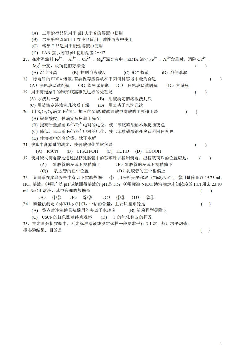 《基础化学实验》模拟试卷一、选择题(每题1分共40分)1邻二氮菲光度法测定铁的实验中,加入NaAc的作用是(A)还原剂(B)显色剂(C)氧化剂D)与盐酸羟氨中HCI的作用起缓冲作用2.用邻苯二甲酸氢钾标定NaOH溶液浓度时,会造成滴定误差的是()(A)以酚酞作指示剂(B)溶解邻苯二甲酸氢钾时加入水的体积不同(C©称取邻苯二甲酸氢钾质量不同D)每份加入指示剂的量不同3.用重量分析法测定水泥熟料中二氧化硅时,洗涤沉淀的目的是(A)洗去生成混晶引起的杂质(B)洗去沉淀表面所吸附的杂质(C)洗去吸留和包夹起的杂质(D)洗去继沉淀的现象引起杂质4.分析纯化学试剂缩写符号是(A)G.R.(B)C.P(C)AR(D)L.P5.常见离子分离和鉴定时采用硫代乙酰胺可用来代替下列试剂是()(A)碳酸胺(B)硫化氢(C)草酸铵(D)氢氧化铵6.鉴定镍离子的试剂通常是下列中的哪一种?()(A)丁二酮肟(B)磺基水杨酸(C)邻菲罗啉(D)二甲酚橙7.配制作为滴定剂的NaS2O5溶液的正确方法是()(A)用分析天平称取准确量的固体试剂,溶于新煮沸并冷却的去离子水中,加入少量固体NCO3,冷却后用棕色容量瓶定容并置暗处备用(B)用分析天平称取准确量的固体试剂,溶于去离子水中并加热煮沸2至3分钟,加入少量固体NCO3,冷却后用棕色容量瓶定容并置暗处备用(©)用台式天平称取所需的固体试剂,溶于新煮沸并冷却的去离子水中,加入少量固体N2CO3,贮于棕色试剂瓶中置暗处3至5天后标定使用(D)用台式天平称取所需的固体试剂,溶于去离子水中并加热煮沸2至3分钟,加入少量固体NCO3,贮于棕色试剂瓶中置暗处3至5天后标定使用8.定量滤纸A等产品的灰分应不超过滤纸质量一(A)0.008%(B)0.009%(C)0.010%(D)0.020%9.三氯化六氨合钴[CoNH)]C3质量的测定中,加入的KI的作用(A)氧化剂、配合剂(B)还原剂、配合剂(C)氧化剂(D还原剂10.从滴瓶中取少量试剂加入试管的正确操作是(A)将试管倾斜,滴管口贴在试管壁,再缓慢滴入试剂(B)将试管倾斜,滴管插入试管内半厘米处缓慢滴入试剂(C)将滴管垂直,滴管口距试管口约半厘米处缓漫滴入试剂(①)将试管垂直,滴管口贴在试管壁,再缓慢滴入试剂11.用pH试纸测定某无色溶液的pH时,规范的操作是(A)将H试纸放入待测溶液中润湿后取出,半分钟内跟标准比色卡比较(B)将待测溶液倒在pH试纸上,跟标准比色卡比较(C)用干燥洁净的玻璃棒蘸取待测溶液,滴在pH试纸上,立即跟标准比色卡比较(D)将pH试纸剪成小块,放在干燥清洁的表面皿上,再用玻璃棒蘸取待测溶液,滴在pH试纸上,半分钟内跟标准比色卡比较12.K+2=KI3平衡常数测定,用N2S2O3滴定2,以淀粉为指示剂,其加入的时间是()(A)滴定开始时加入(B)滴定一半时加入