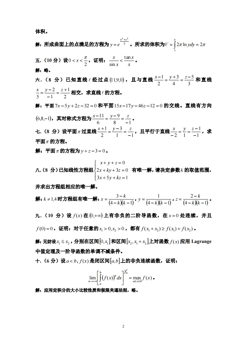 复旦大学数学科学学院2012~2013学年第一学期期末考试试卷A卷答案课程名称:高等数学(B上)课程代码:MATH120003.04开课院系:数学科学学院考试形式:闭卷姓名:学号:专业:题2345678910总号分得分一.(15分,每小题5分)求下面的极限:2.limgnf+rh1→0+r3.lim l-cosx-sinx+In(1+x)1+0xsin2x。二.(15分,每小题5分)计算下面各题:1.fto()=28×90-20x2)cos2x-(2×5rsim2x;2..m时rh=r0-ra-1-小-r0加t-小2s三.(10分)判断广义积分了+h的收敛性,其中p是一个实参数。解:1