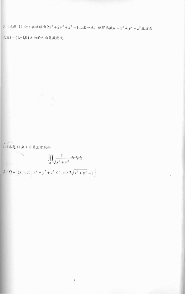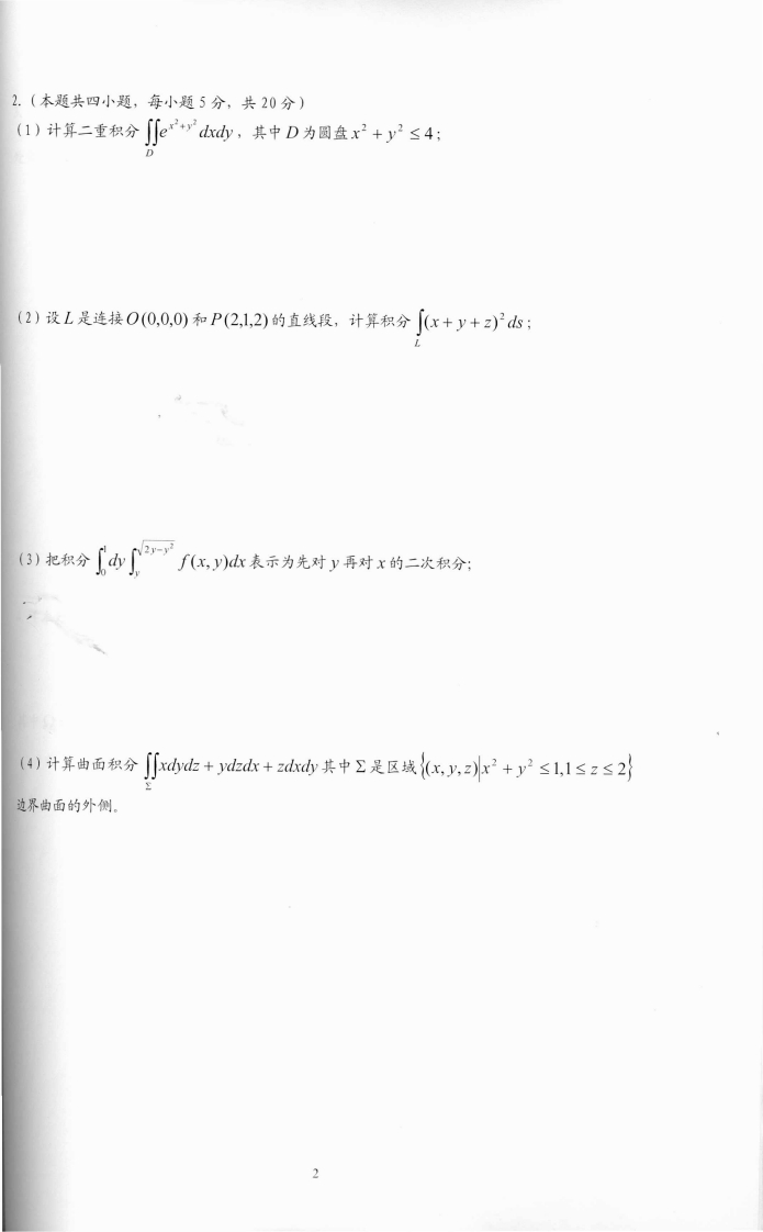 复旦大学数学科学学院2007~2008学年第二学期期末考试试卷A卷课程名称:高等数学A(下)课程代码:MATH120002开课院系:数学科学学院考试形式:闭卷姓名:学号:专业:题号1234568总分得分1.(本题共四小题,每小题5分,共20分)(1)设u=sin(3x-2y),求8uOxdy(2)求曲面e+z+y=3在点(2,1,0)处的切平面方程;切空名-r*接求解微分方程(e+y-e")d+(e+"+e)y=01