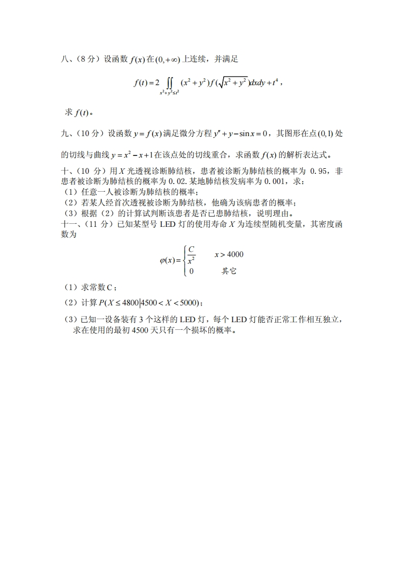 复旦大学数学科学学院2009~2010学年第二学期期末考试试卷A卷课程名称:课程代码:开课院系:考试形式:闭卷姓名:学号:专业:题号1234567869得分15888868810题号1011总分得分1011100一、求极限(15分):1、limsin(xy2)x0,0)x2+y22.ddyn3、m4二、(8分)设z=fx,y)是由方程F0所确定的隐函数,F(x,y)具有连续偏导数,求d。三、(8分)求椭圆亡+上=1的内接等腰三角形,其底边平行于椭圆的长轴,且124使面积最大。四、(8分)计算I=++y,其中D由y=5,x≥0及=1所围.五、(8分)试证:[fx)d≤(n-m)f产(x)d(m、n均为常数)。六、(6分)判别级数a三的敛散性(a>0)。n白a"+n七、(8分)求幂级数2”一了的和函数,并计算数项级数二口的和。(n+1)台(n+1)2”