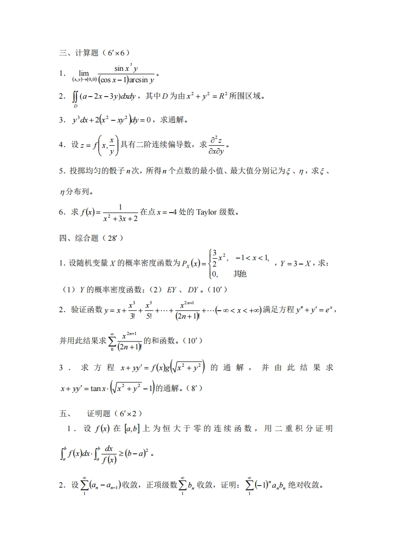 复旦大学数学科学学院2011~2012学年第二学期期末考试试卷口A卷课程名称:高等数学C(下)课程代码:MATH120006.03开课院系:数学科学学院考试形式:闭卷姓名:学号:专业:医学试验班、八年制临床医学题号2345总分得分填充题(4'×3)1.lim2x2-y02x2+y1→02.y"+V1-y2=0,则通解3.方程e-y=的通解为二、单选题(4'×3)1.下列级数中绝对收敛的是(4.←少2n(1+n品B.ey品D.3"2.X~N(0,4),则PX<1)=()eA.3.幂级数-2少的收敛区间是()。nA.,3]B.,3)c.(-10D.1,