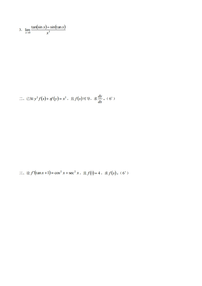 复旦大学数学科学院2012~2013学年第学期期末考试试卷卷348072@abc11小时前发布关注私信0.19MB7页023复旦大学数学科学院2012~2013学年第学期期末考试试卷卷此内容为付费资源,请付费后查看¥9¥19黄金会员免费钻石会员免费立即购买您当前未登录!建议登陆后购买,可保存购买订单付费资源 第1页 / 共7页 第2页 / 共7页 第3页 / 共7页 试读已结束,还剩4页,您可下载完整版后进行离线阅读 THE END网站设计高考真题 文本预览 复旦大学数学科学学院2012~2013学年第一学期期末考试试卷□A卷课程名称:高等数学课程代码:MATH120005.04开课院系:法医学、医学试验班、临床医学(八年制)考试形式:闭卷姓名:学号:专业:题号1234567910总分得分一、求下列极限:(6×3)-北-)1.lim-→11+C0s72.0sintdt 查看更多 收起部分 喜欢就支持一下吧收藏