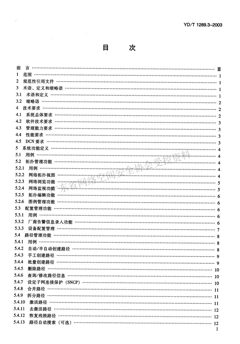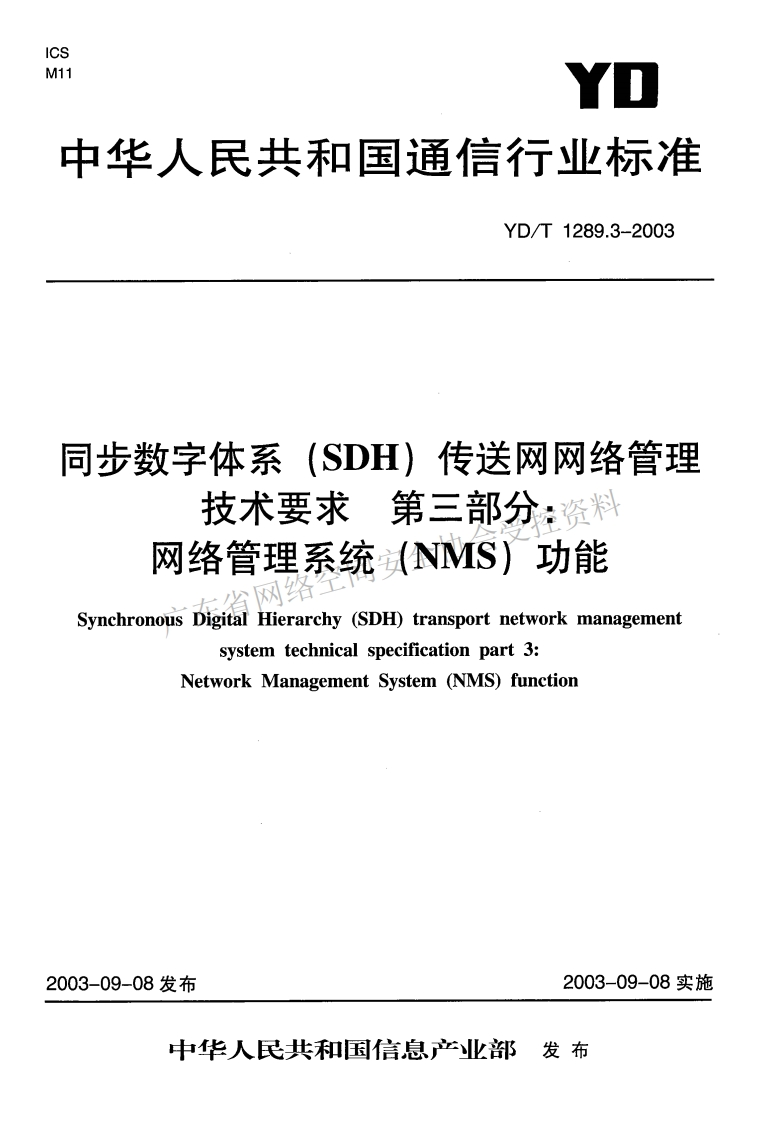 ICS11YD中华人民共和国通信行业标准YD/T1289.3-2003同步数字体系(SDH)传送网网络管理技术要求第三部分:资料网络管理系统试NMS)功能Synchronous Digital Hierarchy (SDH)transport network managementsystem technical specification part 3:Network Management System (NMS)function2003-09-08发布2003-09-08实施中华人民共和国信息产业部发布