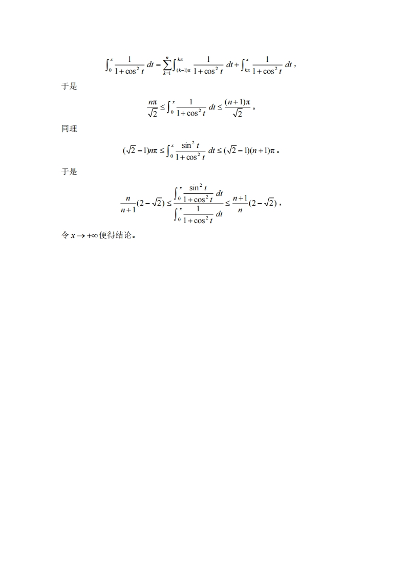 复旦大学数学科学学院2013~2014学年第一学期期末考试试卷《高等数学A》(上)A卷试题答案1.(本题满分48分,每小题6分)(1)血-os,(2)x(3)在,e2]上单调增加,在(0,1]和[e2,+o)上单调减少。f)=0极小值,e)。兰极大值:(4)0,0:(5)2sin(2e*)+C:(6)2:100(7)可逆,A=1120:(8)a≠1且b≠0。011装3订线x∈[0,1),内2.(本题满分8分)F(x)=3F(x)在x=1点不可导。不要2-3xe[l,2]答3.(本题满分8分)(1)y=4x-3((0,-3)点)y=-2x+6((3,0)点):题4.(本题满分8分)a<-上时无实根:a=-时有一个实根:-