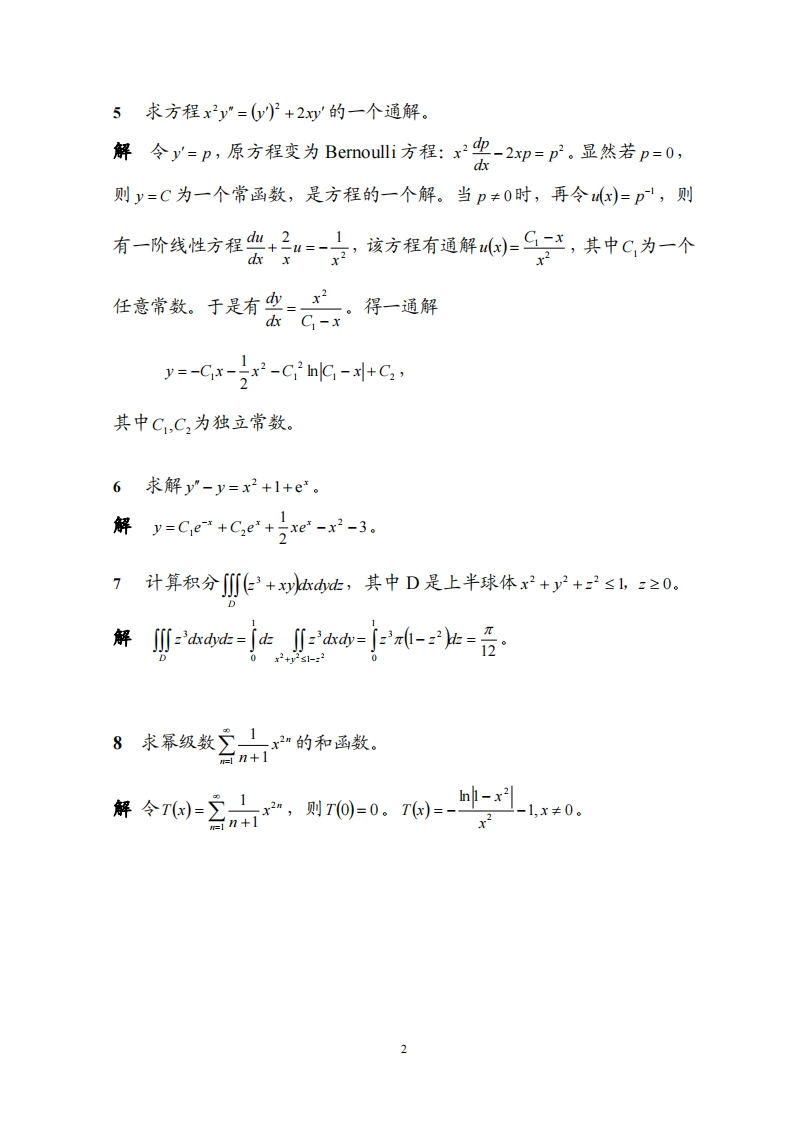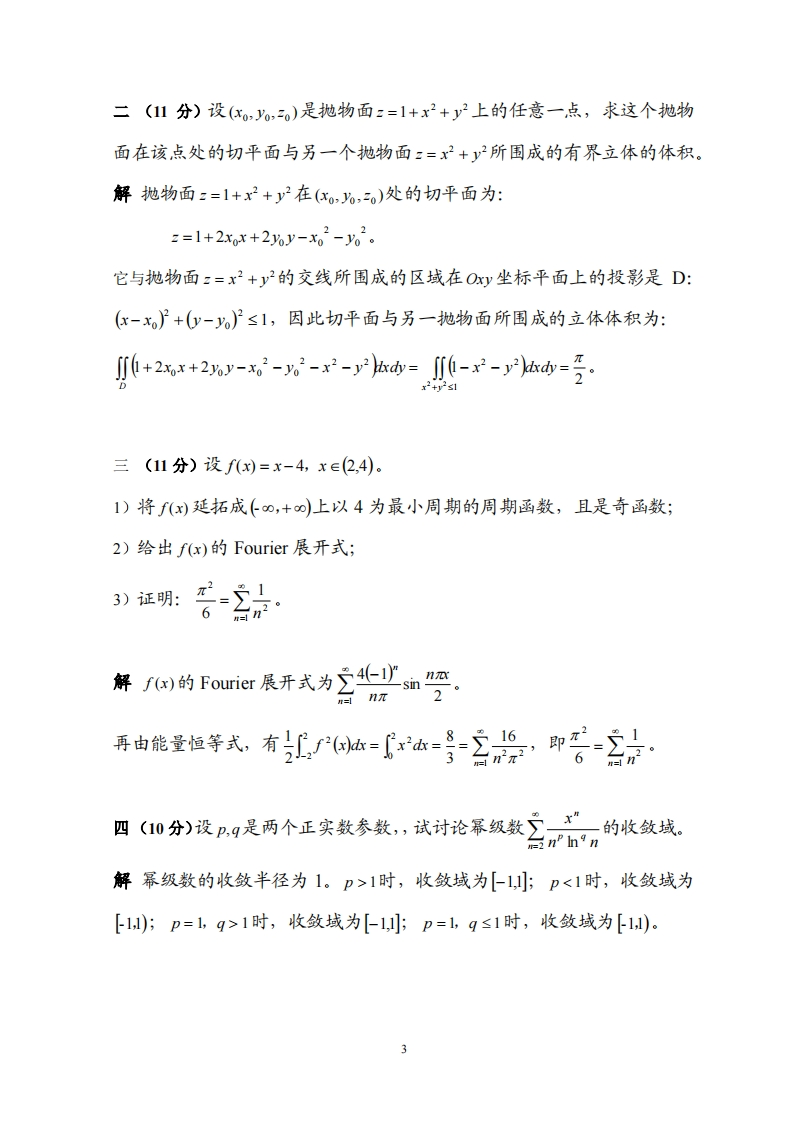 复旦大学数学科学学院2016~2017学年第二学期期末考试试卷A卷课程名称:高等数学B(下)课程代码:MATH120004开课院系:数学科学学院考试形式:闭卷题号三四五六总分得分剑(48分,每小题6分,共8小题)中塑1求f(xy,)=xz在点(1,2,3)处的全微分。如制解d1,2,3)=6x-1)+36-2)+2(2-3)长?都2,1一在点1-)处沿着方向01-)的方向导数。5尔求fxy,)=1+x+归北解方-u3交换二次积分的次序:「.d解dof.y+dof.y4计算二重积分:ly-x2hxd。款a,0,解-w-w+0-w。+后)君0,10,1