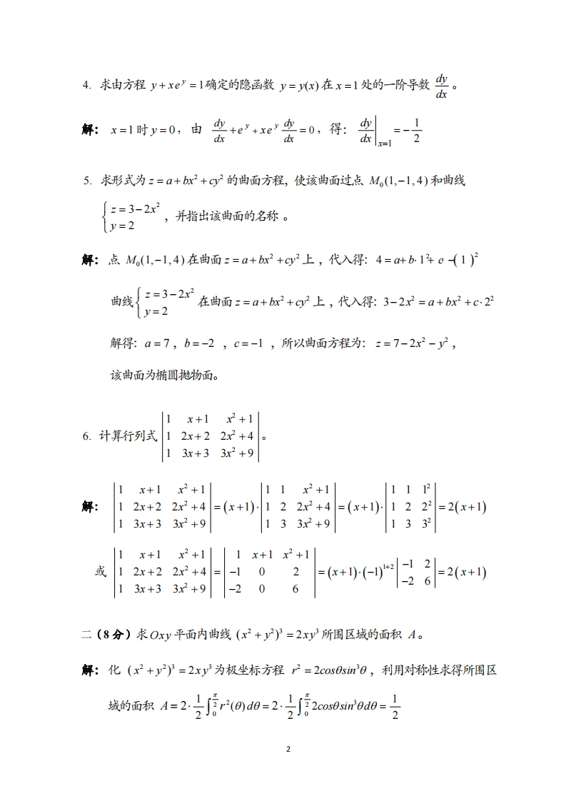 复旦大学数学科学学院2017~2018学年第一学期期末考试试卷A卷(共八页)课程名称:高等数学B(上)课程代码:MATH120003开课院系:数学科学学院考试形式:闭卷题三四五六七八九总分得分一(36分,每小题6分,共6小题)1.求极限m加1+x)a1+子的值。lim m(+))lim in(1+x)im2.设常数a>0,a≠1,已知fx)=am+(lm),求导数f'(x)。解:fe)=aa.a文+a-0m-,八恶授高-眉tdx arcsin(2x-1)+c该题不定积分还可以是:arccos(1-2x)+c、2 arcsinx+c、-2 arcsin.√1-x+C、2 arctan.x+c、-2 arctanV1-x