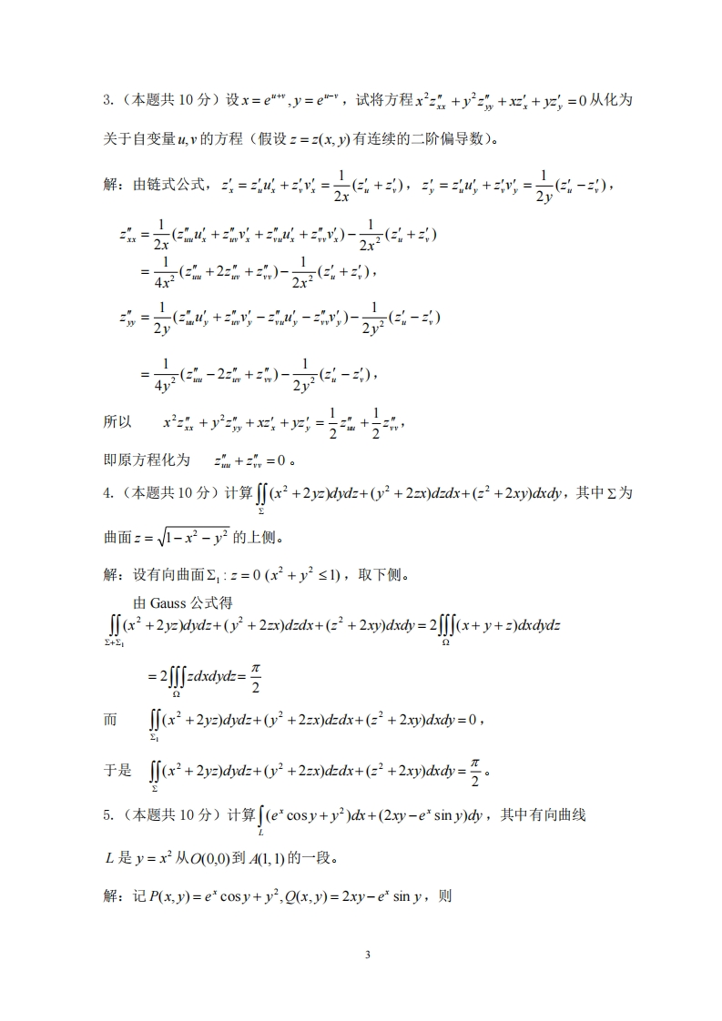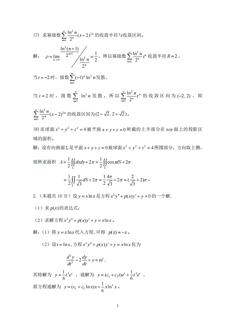 复旦大学数学科学学院2017~2018学年第二学期期末考试试卷A卷解答1.(本题共40分,每小题5分)计算下列各题(1)设z=(1+xy)21n1+y),求z。解:=(1+xy)2ln1+y)+l)。回架方器y-子=2,解:可得(x2y)'=2,所以通解y=x2(2x+c)。芦中(3)求椭球面x2+y2+-=1上一点,使得在这点的椭球面切平面与x-y+2x=4平行。塑解:切平面法向为(2x,2y,2),可设2x 2y如,=t制长所求点为±区代入方程,E+=,所以1=442隔2.都尔(4)求函数u=x3+2y2-3x-12y的极值。蝶解:先求驻点,4=3x2-3,=4y-12,得驻点(1,3),(-1,3),由4=6x,4=4,4=0,在点(1,3),△=404-42=24>0,且4=6>0,所以函数在点(1,3)有极小值山=-20,在点(-1,3),△=-4,2=-24<0,所以函数在点(-1,3)没有极值。妒(⑤)计算[(x+y)dk,其中曲线L:x2+y2=2x。款解:原式=(1+cos0+simn8)dB=2r。(6)计算:,共中n由:=3--了和:=0所围。解:原式tdd=x-(6-t=2x。1