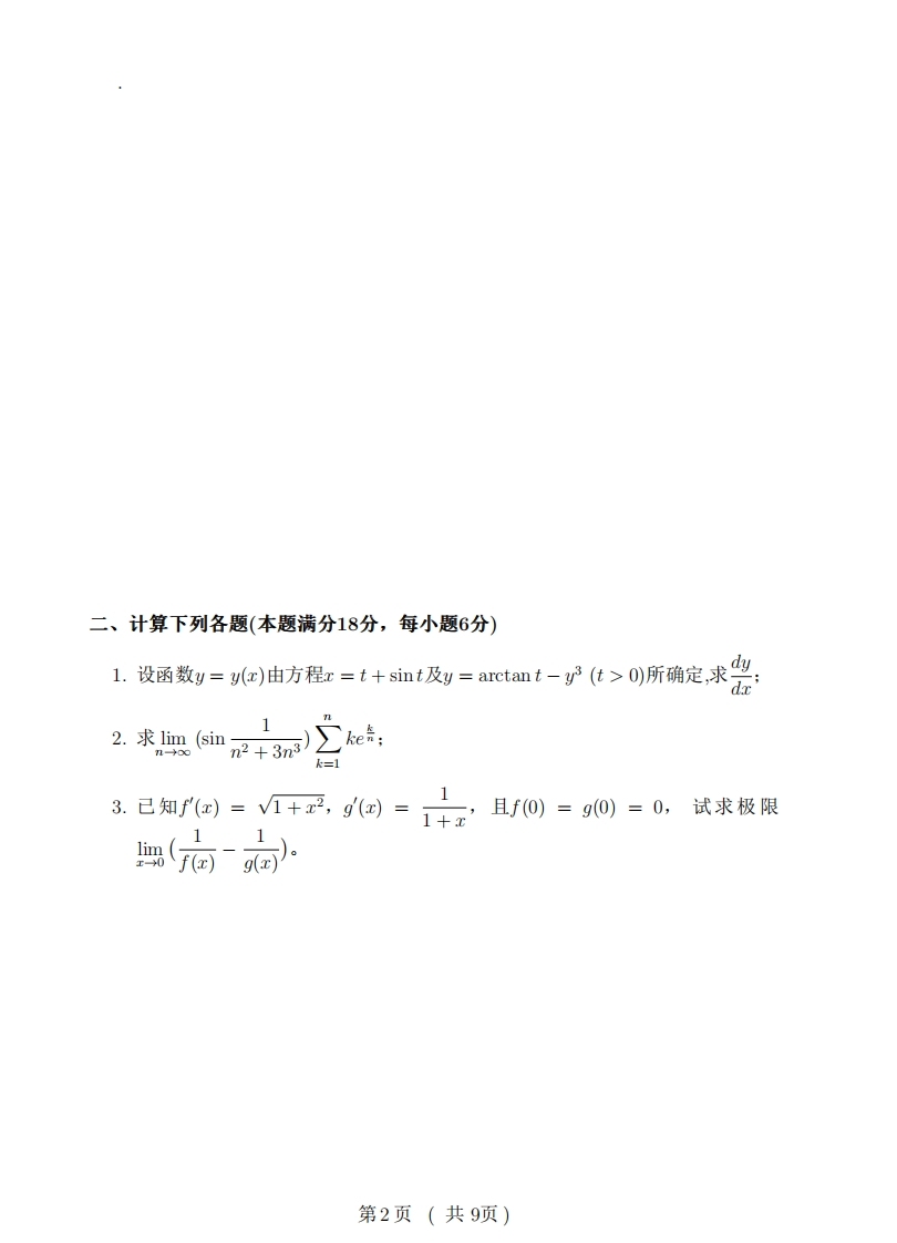 复旦大学数学科学学院2017~2018学年第一学期期末考试试卷A卷课程名称:高等数学A(上)课程代码:MATH120021母:开课院系:数学科学学院考试形式:闭卷题目三四五六七八总分得分一、简单计算题(本题满分18分,每小题6分)1.求1im(1+5x)立;2.设f(x)=xer,求fm(x),n≥1:罪3.求函数arccos x的Maclaurin展开式(到4阶)。毁第1页(共9页)