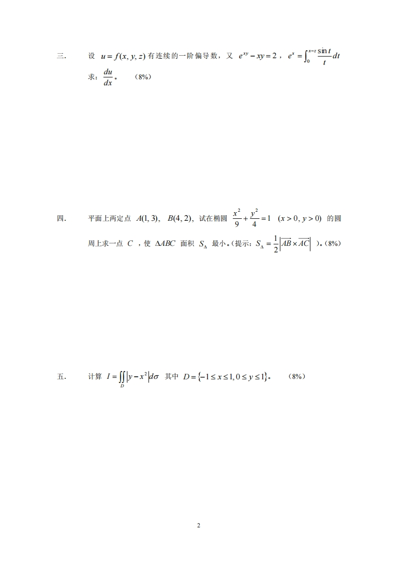 复旦大学数学科学学院2005~2006学年第二学期期末考试试卷A卷课程名称:高等数学C课程代码:218.103.2开课院系:数学科学学院考试形式:闭卷姓名:学号:专业:医学题号12345678总分得分题号910111213141516得分装求极限:(2*7%)订线内不要答题1.im(x”+y")ex+:2"n!2.limj→+∞二设f(x,y,)=xcosy+ycos+zcoSx求df0,0,0)。(8%)1+cosx+cosy+coS