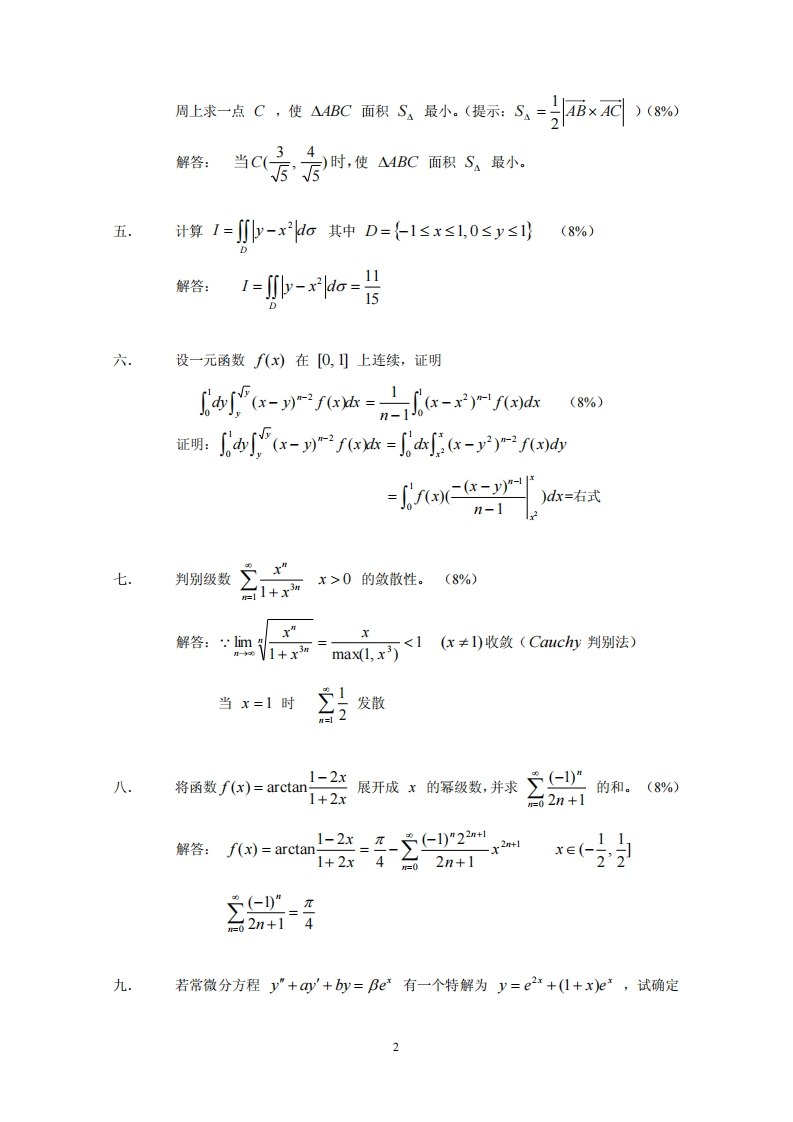 复旦大学数学科学学院2005~2006学年第二学期期末考试试卷A卷课程名称:高等数学C课程代码:218.103.2开课院系:数学科学学院考试形式:闭卷姓名:学号:专业:■医学题号12345678总分得分题号910111213141516得分装订求极限(2*7%)多i(x+y")e2"l1.2.limj→+m要解答:=0=0题二f(x.y)=xcosy+ycos=+=cosx求df0,0,0)(8%)1+cosx+cosy+cosz解答:d0,0,0)=2dk+d+da三=,y)有连续的一阶偏导数,又e”一y=2,e=s四求:du(8%)dx解答:装四.平面上两定点4L,3到,B4,2,试在椭圆。+子=】>0,>0的圆订线才要