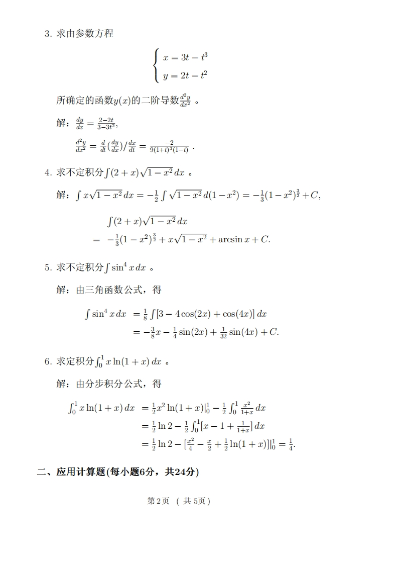 复旦大学数学科学学院2010~2011学年第一学期期末考试试卷口A卷课程名称:高等数学B(上)课程代码:MATH120003开课院系:数学科学学院考试形式:闭卷姓名:学号:专业:题目12345678总分得分订线不要答题一、计算题(每小题6分,共36分)1.求lim2m+sinn。几→0@解:2n-1≤2n+sinn≤2n+1,lim W2n-1 =1,n+00,,,,,,,,,,,,,,,,,,,,,,,,,,,,,,,,lim2m+1=1,n-00由夹逼定理得,lim2n+sinn=1。n→0∞2.求limIn(1+x)-xo zIn(1+x)解:由L'Hospital法则,得limIn(1+x)-ozIn(1+x).二lim一xx0x+(1+x)ln(1+x)-1=玛2+n(1+=-2第1页(共5页)