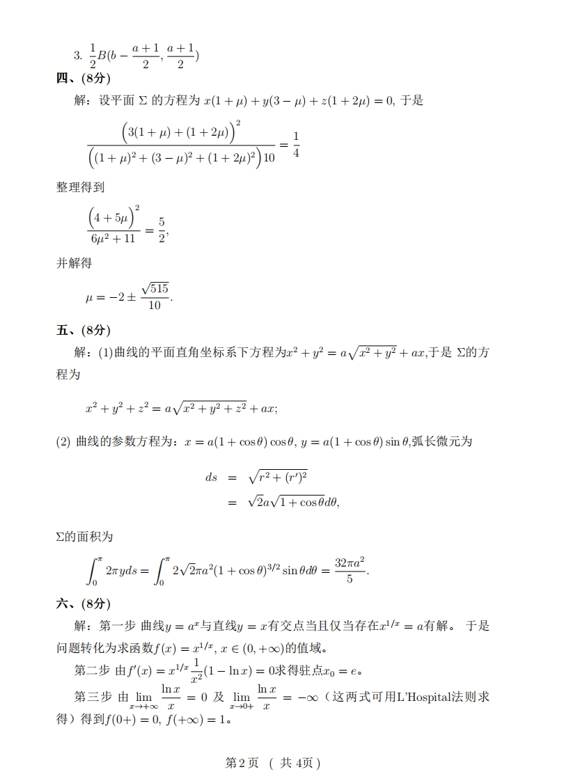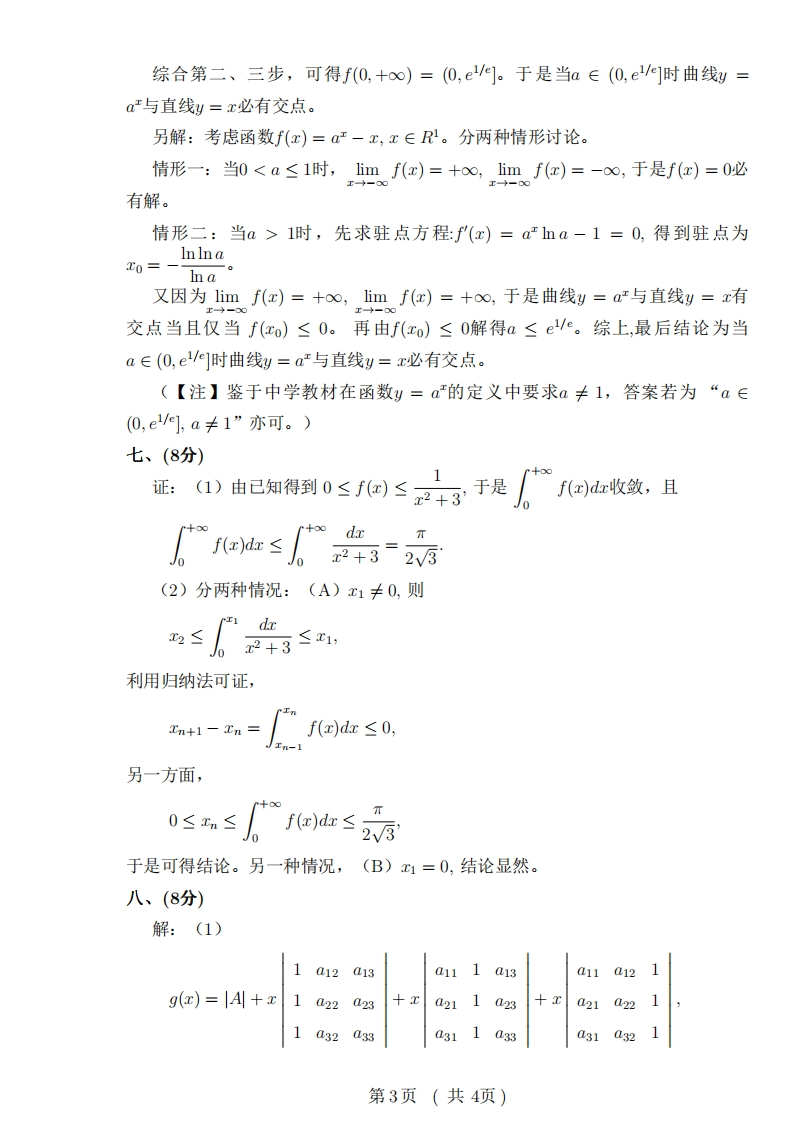 复旦大学数学科学学院2017~2018学年第一学期期末考试试卷A卷(参考答案)课程名称:高等数学A(上)课程代码:MATH120021开课院系:数学科学学院考试形式:闭卷题目三四五六七八总分得分一、计算(每题6分,共18分)1.e5.2.xe=ne=.13.(arccosx)'=-1-28+o(x4),恤()V1-x2arccos-2-x-6十o(x4)n:二、计算下列各题(每题6分,共18分)11.xt=1+c0st,班=dy(1+3y2)1+t2)'dz(1+cost)(1+3y2)(1+t2)2.原式=limxe"dx =0.3n3ken=0×03.)g(x)-f'(x)fr9()+fc9(网limg"(x)-f"(x)毁f"(x)g(x)+2f(x)g'(x)+f(x)g"(x)1三、计算下列积分(每题8分,共24分)1.j((+DV+1+1+(+1)+VG+1+1)+C元do2.2π1+2a cos 0+a2(采用变换t=1+2ac0s0+a2a2-1tan号时,0=π及0=-π分别对应于x=+o∞及x=-o。)第1页(共4项)