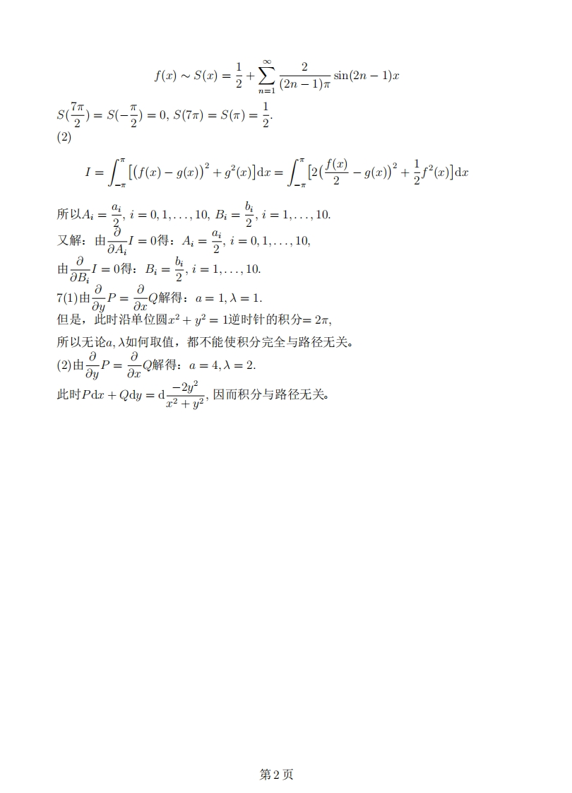 复旦大学数学科学学院2012~2013学年第二学期期末考试■高数A(下)A卷参考答案1.(1)zx(1,1)=3,2(1,1)=-4.(2)-x+2y+2z-3=0或1=1=-169_12x-3y+5z-4=0(3)2π.6产(6)2小时。2.2(s)=v②23.因为limz0f()-f(0)-f"(0)f"(0)z22所以3%>0n>o:lf(分)-fj0)-f'o)2<1f"(0川+1因而n2(1)f(0)≠0时,级数发散:(2)f(0)=0,f'0)≠0时,级数条件收敛:(③)f(0)=f(0)=0时,级数绝对收敛。4.记r=√2+y2,则z=2xf(r2)+2xr2f'(r2),zr=2f(r2)+2r2+8x2]f'(r2)+4x2r2f"(2),同理:2y=2f(2)+22+8g21f'(2)+42r2f"(2),所以:2x+2yy=4f(2)+12r2f'(2)+4r4f"(2)=0.记y(t)=f(e),则:"+2y+y=0,y=(C1+C2t)e-t.所以:f)=+C2血”,代入初始条件得:f回)=血严x5.记r=V2+4y2+4z2,则:4y20r5所以:品原品原式=xdydz+ydzdx zdxdy =3dadydz =T.x2+4y4+4z2=1的外侧x2+4y4+4z2≤16(1)a0=1,am=0(n≥1),bm=1+(-1)n-1n元第1页