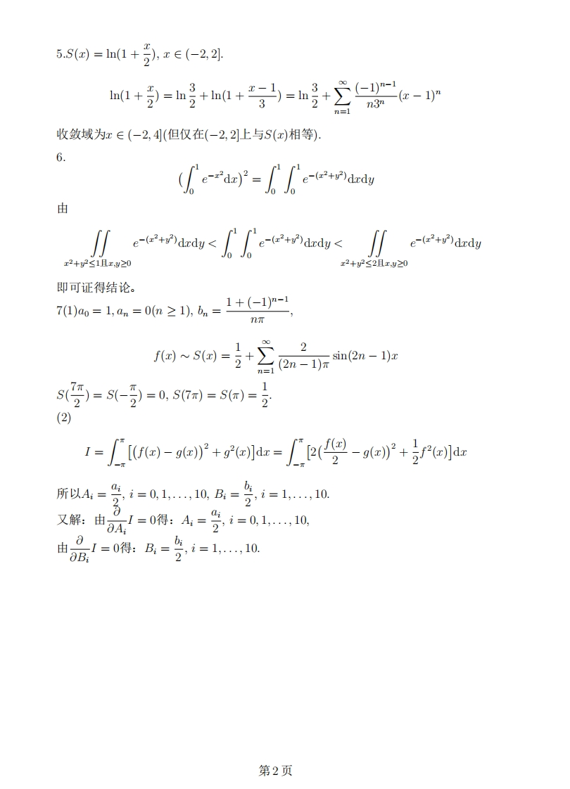 复旦大学数学科学学院2012~2013学年第二学期期末考试■高数B(下)A卷参考答案1.(1)2z(1,1)=32(1,1)=-4.-x+2y+2z-3=0(2)162x-3y+5z-4=0(3)2m.(4)π.-1.(6)2小时。2.显然最大值可在0≤x及y≤0且x-y≤1时取到.由z红=y=0可解得:x=y=0,2(0,0)=0:由x=0:之=y2,y=-1时z取最大值1由y=0:之=x2,x=1时z取最大值1:由y=x-1,x∈[0,1:z=x2-x+1,x=1时z取最大值1;所以之的最大值为1,3.因为imo@)-fo)-f"oe=f02所以3%>0n>o:f分)-f0-fo月<"O+1,因而:n2(1)f(0)≠0时,级数发散:(2)f(0)=0,f'(0)≠0时,级数条件收敛:(③)f(0)=(0)=0时,级数绝对收敛。4.记r=√x2+y2,则ax=2xf(r2)+2xr2f'((r2),zr=2f(r2)+[2r2+8x21f(r2)+4x2r2f"(r2),同理:2yg=2f(2)+22+8g21f'(2)+422f"(2),所以:2r+2y=4f(2)+12r2f'(2)+44f"(r2)=0.记y(t)=f(e),则:”+2+y=0,y=(C+C2t)e-t.所以:f回=C+C血工,代入初始条件得:f)=马x2第1页