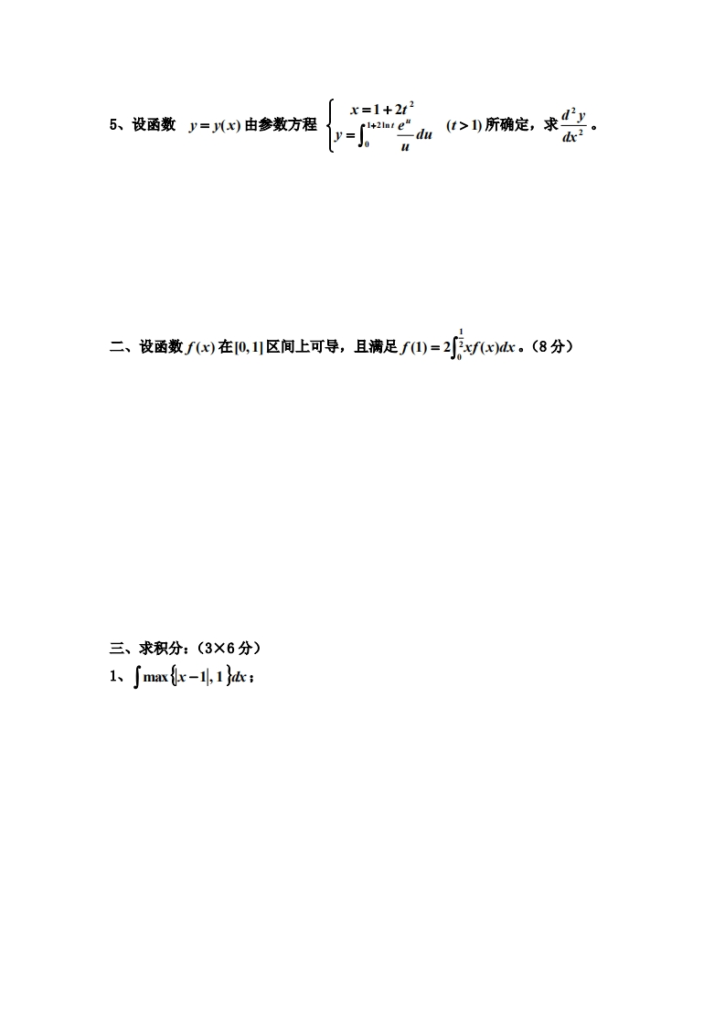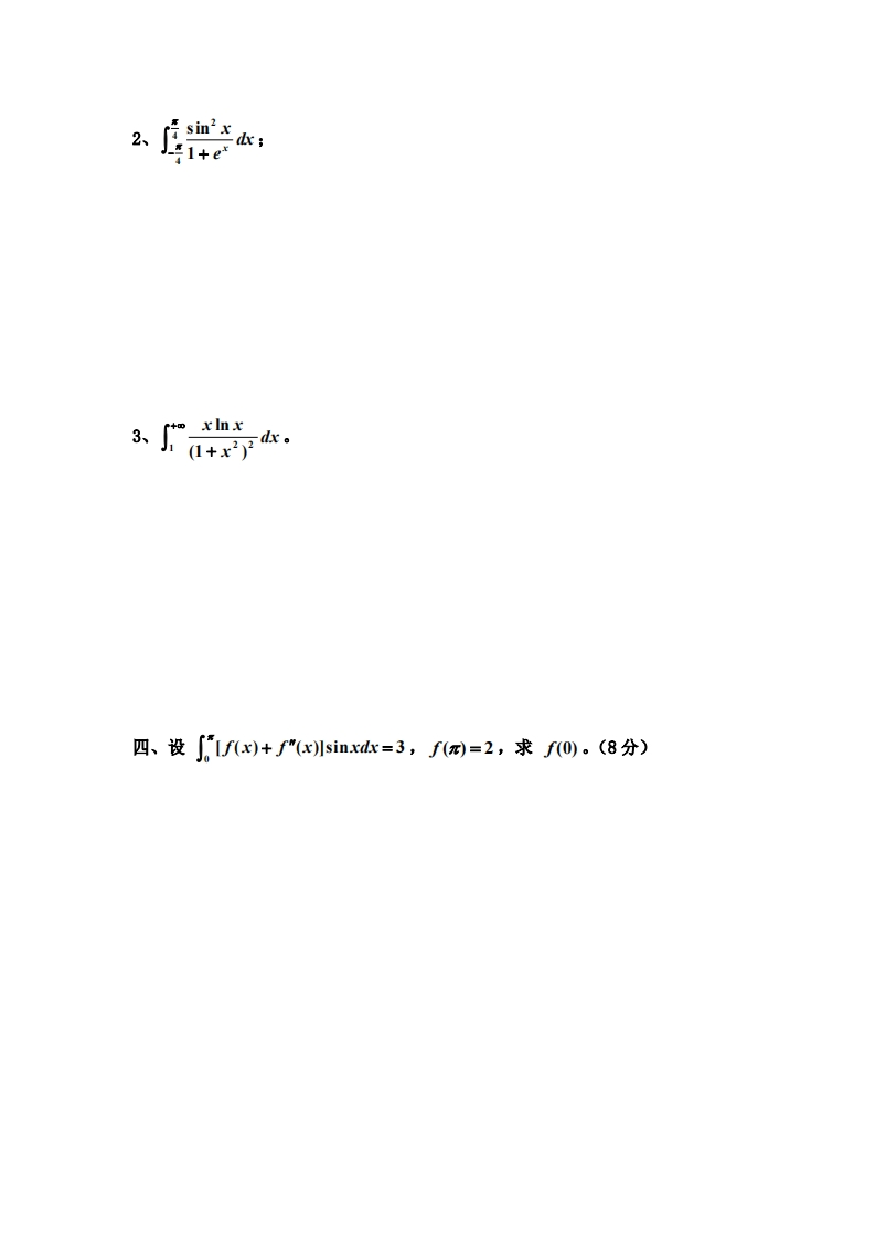 复旦大学数学科学学院系2009~2010学年第一学期期末考试试卷A卷课程名称:高等数学C课程代码:MATH120005.03开课院系:数学科学学院考试形式:闭卷姓名:学号:专业:题号12345678总分得分计算下列各题:(6X5分)21、m3e-212、lime n3、设f"x)存在,求imx+)+fx-)-2f四,h24、已知im(x)sinx+1-1-2,lim f(x)x+0e4x-1r