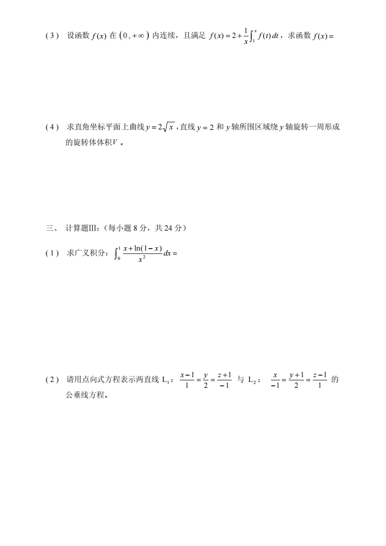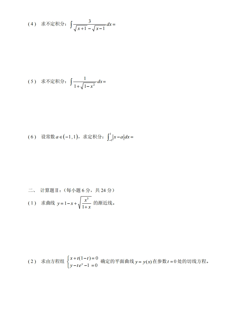 复旦大学经济学院2008~2009学年第一学期期末考试试卷卷高等数学B课程名称_课程代码_MATH120003348072@abc15小时前发布关注私信72.84KB4页041复旦大学经济学院2008~2009学年第一学期期末考试试卷卷高等数学B课程名称_课程代码_MATH120003此内容为付费资源,请付费后查看¥9¥19黄金会员免费钻石会员免费立即购买您当前未登录!建议登陆后购买,可保存购买订单付费资源 第1页 / 共4页 第2页 / 共4页 第3页 / 共4页 试读已结束,还剩1页,您可下载完整版后进行离线阅读 THE END网站设计高考真题 文本预览 复旦大学经济学院2008~2009学年第一学期期末考试试卷A卷课程名称:高等数学B课程代码:MATH120003开课院系:数学科学学院考试形式:闭卷姓名:学号:专业:题号三四总分得分一、计算题I:(每小题6分,共36分)(1)求极限:m[x-rh+](2)求极限:m+2x-+3xx→0(3)求函数y=(1+x)的微分d= 查看更多 收起部分 喜欢就支持一下吧收藏