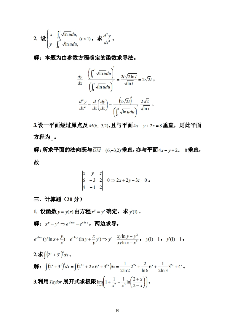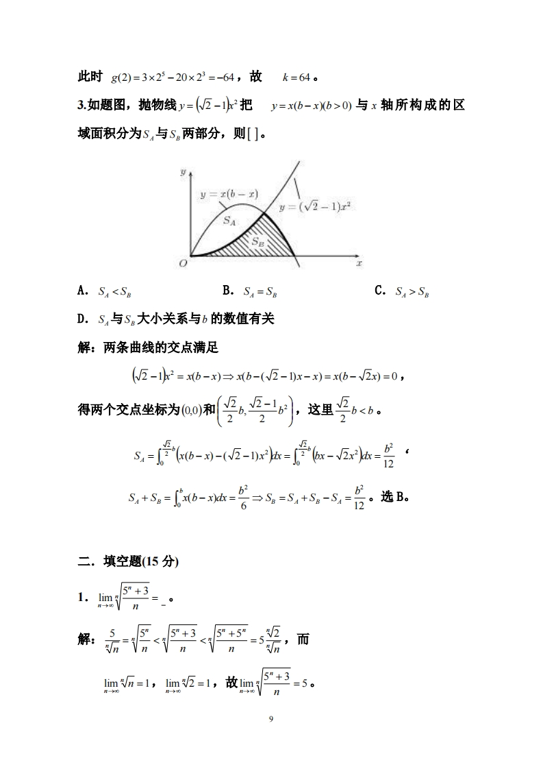 复旦大学自然科学试验班、经济管理试验班2011~2012学年第一学期期末考试试卷(A卷)课程名称:高等数学(B)课程代码:MATH120003开课院系:数学科学学院考试形式:闭卷姓名:学号:专业:题号1234678总分得分一.选择题(15分)1.设函数g)在x=0点某邻域内有定义,若m二8)-1成立,则[]。x→0sinxA.g(x)在x=0点连续,但不可导B.g(x)在x=0点可导但导数不为0C.Iimg(x)存在,但g(x)在x=0点不连续D.x→0时,g()是x的高阶无穷小量解:由1m=8)=l,知1m(x-g》=0,mg)=lmx=0。sinx1im8)=lm8)-r+x Sinx=-1+1=0。选D。sinx2.已知fx)=3x2+k3(k>0),当x>0时,总有f(x)≥20成立,则参数k的最小取值是[]。A.32B.64C.72D.96解:f(x)=3x2+kx3≥20=3x5-20x3+k≥0显然由题设k>0,要满足上述不等式恒成立(x>0),需要求出g(x)=3x-20x2的最小值(负值)。令g'(x)=15x4-60x2=0=x=±2,但x>0只能x=2。