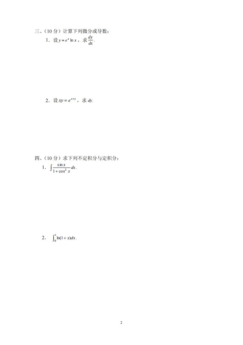 复旦大学复旦学院2009~2010学年第一学期期末考试试卷回A卷□B卷课程名称:高等数学B(上)课程代码:MATH120003.02开课院系:数学科学学院考试形式:闭卷姓名:学号:专业:题号12345678910总分得分装一、(10分)判断下列叙述是否正确:订l.若limf(x=0,则imfx)=0.内2.初等函数在定义区间内部一定可导()3.若fx)在处取得极大值或极小值,则(xo)=0.()要4.若fx)可导,则∫f(xdr=fx)(5.向量a与b的外积等于以a与b为邻边的平行四边形的面积.题二、(10分)求下列极限:n2+11.lim-→o2n2-n+1/n2.lim1+sinx -1→0ex-1