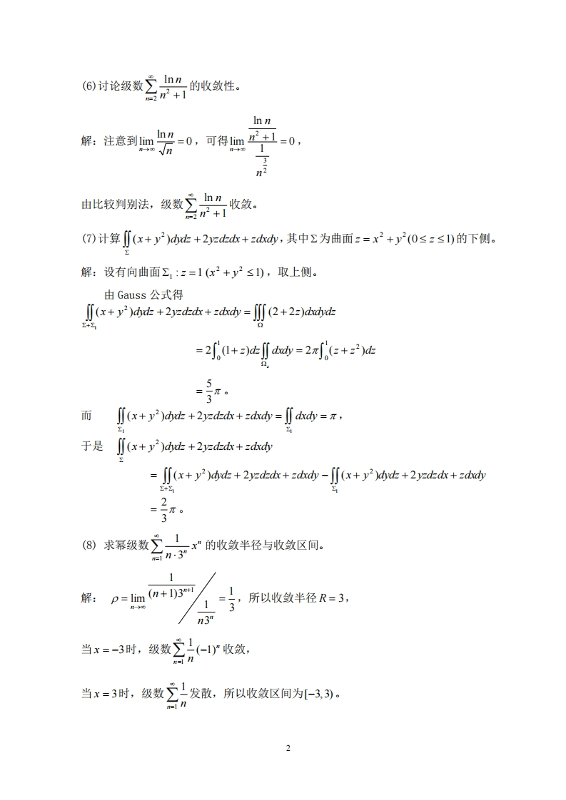 复旦大学数学科学学院2014~2015学年第二学期期末考试试卷A卷课程名称:高等数学A(下)课程代码:MATH120002开课院系:数学科学学院考试形式:闭卷题号23456总分得分1.(本题共48分,每小题6分)计算下列各题(1)设z=(x2+y2)ln(x2+y),求,20解:=2x(In(x2+)+1),4xyx2+(2)解方程y'-y=x2。解:=1,得y=x2+cx。(3)求函数u=y+zx+z在点(1,1,1)处沿方向1=(1,-2,2)的方向导数。解:由4,=y+,4,=x+2,4.=x+y,得0-2写2号2号号(4)求函数u=x2+y2+z2在条件x+2y+3z=14(x,y,z≥0)下的极值。解:作Lagrange函数L(x,y,3,)=x2+y2+z2+2(x+2y+3z-14),L.=2x+元=0L,=2y+2=0,得x=1y=2,z=3,为极小值点,um=14。L.=2z+3=0L2=x+2y+3z-14=0(⑤)计算∬(x+y)dd,其中D:x2+y2≤2y。解:由对称性,∬hd=0,所以∬(x+)d=sinu0rd=。1