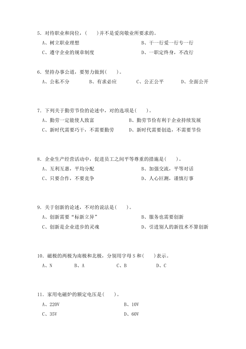 贵州电子科技职业学院2025年高职(专科)分类招生考试专业能力测试题库(七)(中职类)适用专业:电气自动化技术、电气自动化技术(电梯方向)、制冷与空调技术、工业机器人技术、机械设计与制造、数控技术、数控技术(数维方向)一、单项选择1.职业道德是指从事一定职业劳动的人们,在长期的职业活动中形成的()。A、行为规范B、操作程序C、劳动技能D、思维习惯2.职业道德与人的事业的关系是()。A、有职业道德的人一定能够获得事业成功B、没有职业道德的人不会获得成功C、事业成功的人往往具有较高的职业道德D、缺乏职业道德的人往往更容易获得成功3、分析和计算复杂电路最基本的方法是()。A、支路电流法B、回路电流法C、叠加原理D、节点电压法4.电荷的基本单位是()。A、公里B、厘米C、库伦D、千克
