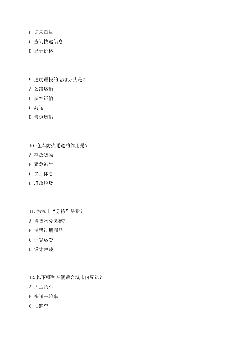 (中职类)贵州电子科技职业学院2025年高职(专科)分类招生考试专业能力测试题库(五)348072@abc9小时前发布关注私信78.52KB81页050(中职类)贵州电子科技职业学院2025年高职(专科)分类招生考试专业能力测试题库(五)此内容为付费资源,请付费后查看¥9¥19黄金会员免费钻石会员免费立即购买您当前未登录!建议登陆后购买,可保存购买订单付费资源 第1页 / 共81页 第2页 / 共81页 第3页 / 共81页 试读已结束,还剩78页,您可下载完整版后进行离线阅读 THE END网站设计高考真题 文本预览 贵州电子科技职业学院2025年高职(专科)分类招生考试专业能力测试题库(五)(中职类)适用专业:电子商务、电子商务(数字贸易方向)、市场营销、现代物流管理一、单选题1.快递员将包裹送到顾客手中属于物流中的哪个环节?A.运输B.配送C.包装D.仓储2.搬运纸箱货物时最常用的工具是?A.叉车B.轮船C.飞机D.自行车3.配送中心的主要作用是?A.生产商品B.集中分拣和发货物C.销售商品D.维修车辆 查看更多 收起部分 喜欢就支持一下吧收藏