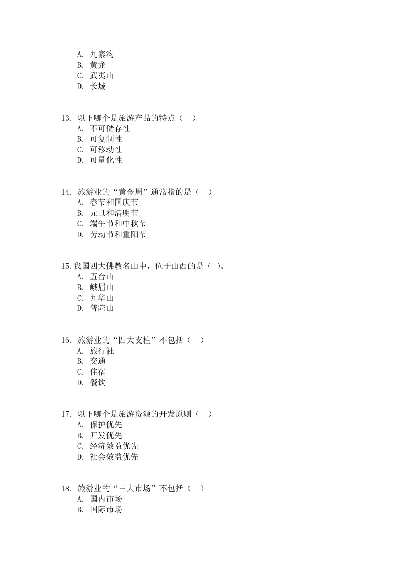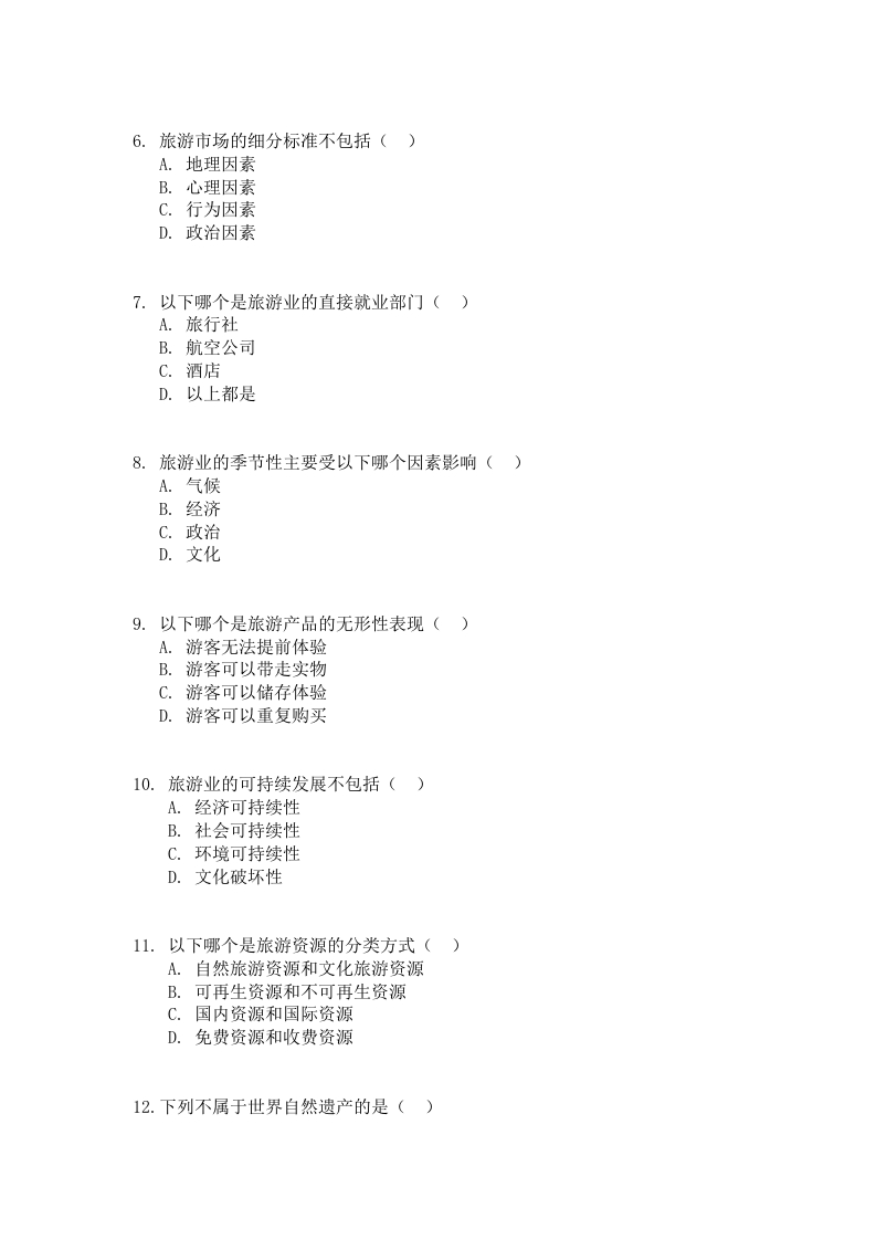 贵州电子科技职业学院2025年高职(专科)分类招生考试专业能力测试题库(六)(中职类)适用专业:旅游管理、视觉传达设计一、单选题1.旅游业的三大支柱是()A.交通、住宿、餐饮B.交通、住宿、景点C.交通、住宿、旅行社D.交通、住宿、购物2.世界上最大的旅游组织是()A.世界旅游组织(UNWTO)B.国际航空运输协会(IATA)C.世界旅行社协会(WATA)D.国际酒店协会(IHA)3.中国最大的淡水湖是()。A.青海湖B.洞庭湖C.鄱阳湖D.太湖4.旅游产品的核心是()A.交通B.住宿C.体验D.购物5.以下哪个是旅游资源的特征()A.不可再生性B.可复制性C.不可移动性D.可储存性