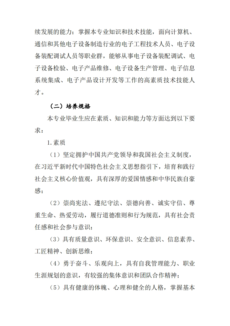 2021级电子信息工程技术人才培养方案一、专业名称及代码专业名称:电子信息工程技术专业代码:510101二、入学要求普通高级中学毕业、中等职业学校毕业或具备同等学力。三、修业年限三年。四、职业面向表1本专业职业面向所属所属专对应行业主要职业类主要岗位群或职业资格证专业业类(代码)别技术领域举例书和职业技大类(代码)(代码)能等级证书(代电子设备装配调试:电子工程技术人电子设备检验:电子信息计算机、通信和广电和通信设备员(2-02-09):调试工四级或三大类电子信息类电子产品维修:其他电子设备(5101)电子设备装配调电子设备生产管理:级:(51)制造业(39)试人员(6-25-04)电子信息系统集成:电子产品设计开发五、培养目标与培养规格(一)培养目标本专业培养理想信念坚定,德、智、体、美、劳全面发展,具有一定的科学文化水平,良好的人文素养、职业道德和创新意识,精益求精的工匠精神,较强的就业能力和可持