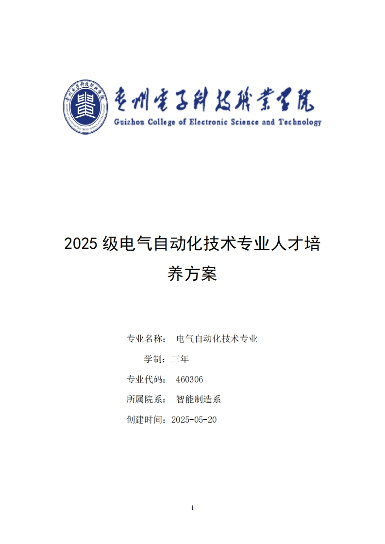 附件5:贵州电子科技职业学院专业人才培养方案审核意见表(2025级)学历层次高职专业名称电气自动化技术教学系部智能制造系专业负贵人霍亮教学系部意见:己根据职业教育国家教学标准(2025)相关要求制订木方案,系主任签名:日4呢教务处审核意见:同意,位序悦甲接,日鼎0处分管教学副院长审核意见鹿.格疗胶席接分管损学副院长签名:d多星日期为28门0月院长办公会审议意见已过半第7次浅励公含液露多ual党委会审核意见8经嘴次米多金以年w辛ml为日期平扫描全能王创