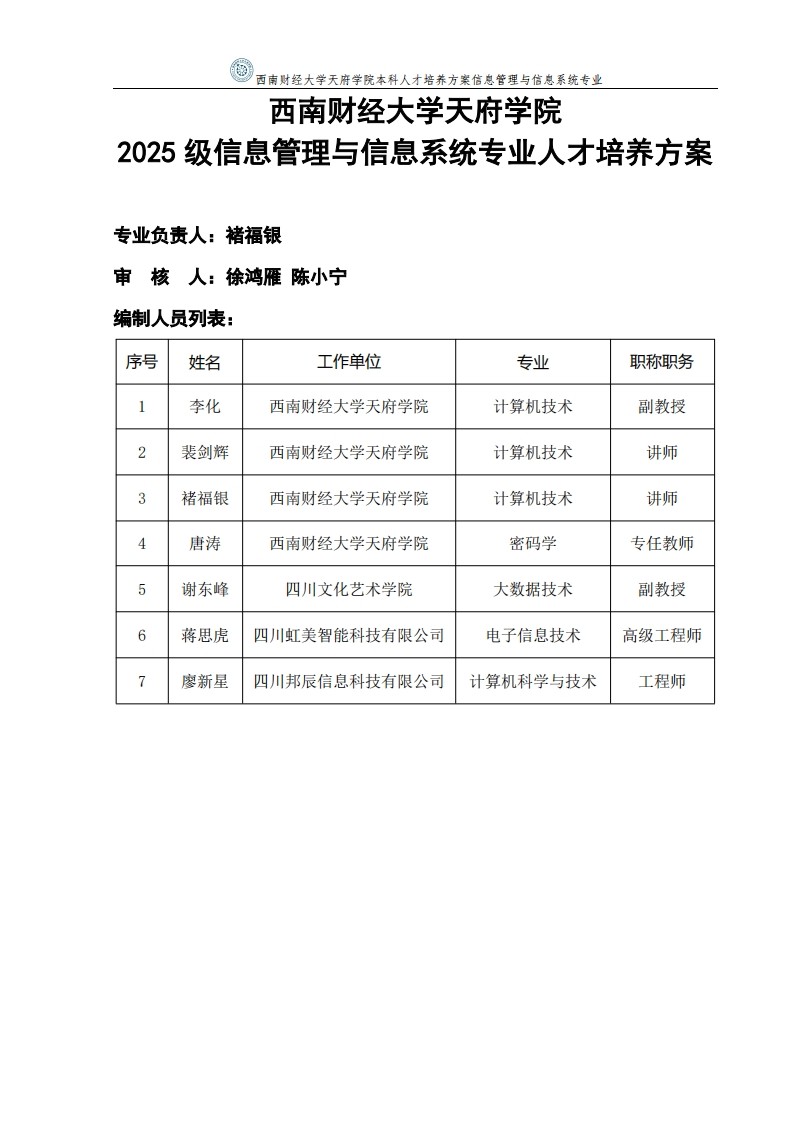 2025级信息管理与信息系统专业本科人才培养方案348072@abc23小时前发布关注私信0.60MB23页0472025级信息管理与信息系统专业本科人才培养方案此内容为付费资源,请付费后查看¥13¥29黄金会员免费钻石会员免费立即购买您当前未登录!建议登陆后购买,可保存购买订单付费资源 第1页 / 共23页 第2页 / 共23页 第3页 / 共23页 试读已结束,还剩20页,您可下载完整版后进行离线阅读 THE END办公模板员工培训 文本预览 @西南财经大学天府学院本科人才培养方案信息管理与信息系统专业西南财经大学天学院】TIANFU COLLEGEOFSWIFE西南财经大学天府学院信息管理与信息系统专业人才培养方案(2025级本科)版号:2024版编制学院:智能科技学院审核人:徐鸿雁、陈小宁颁布日期:2025-03-01生效日期:2025-08-01西南财经大学天府学院研究与发展处制二零二五年三月 查看更多 收起部分 喜欢就支持一下吧收藏