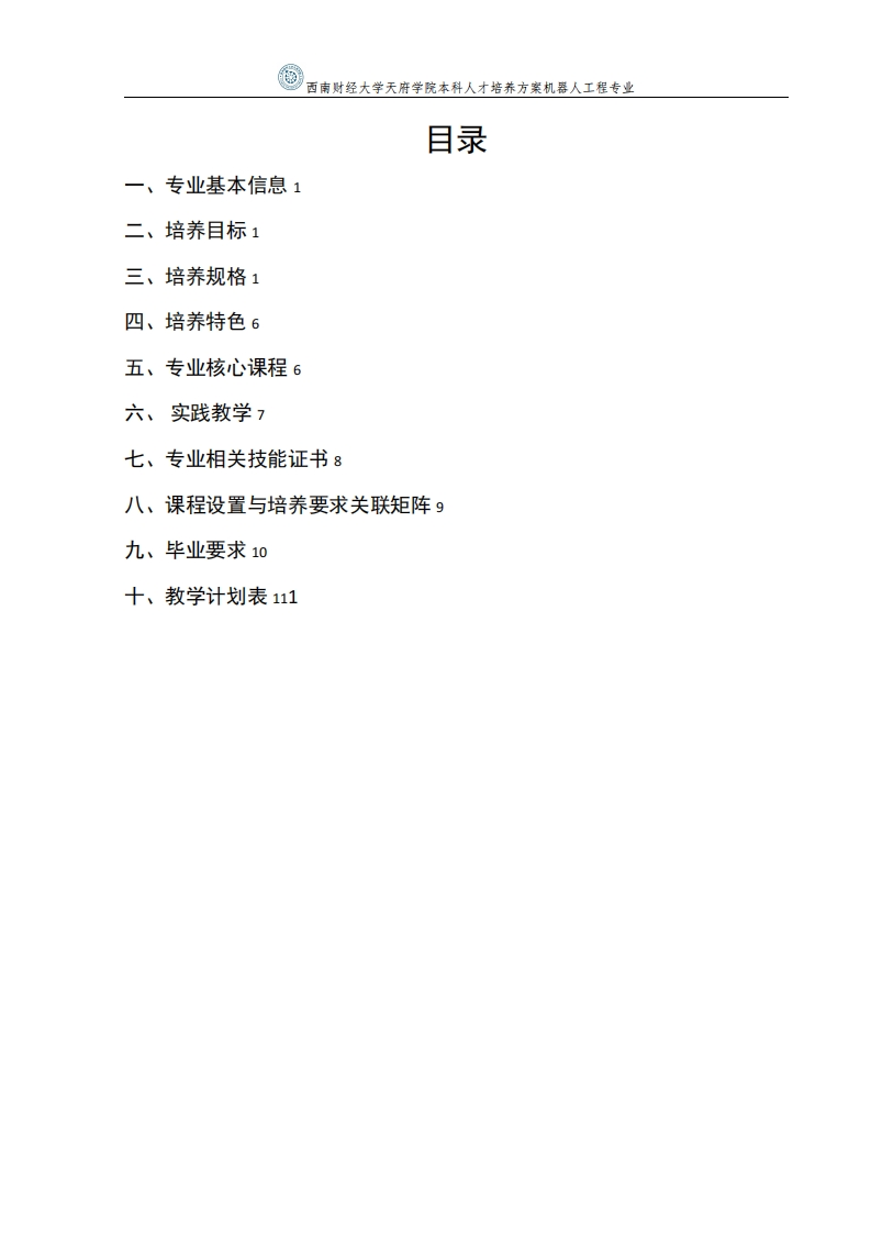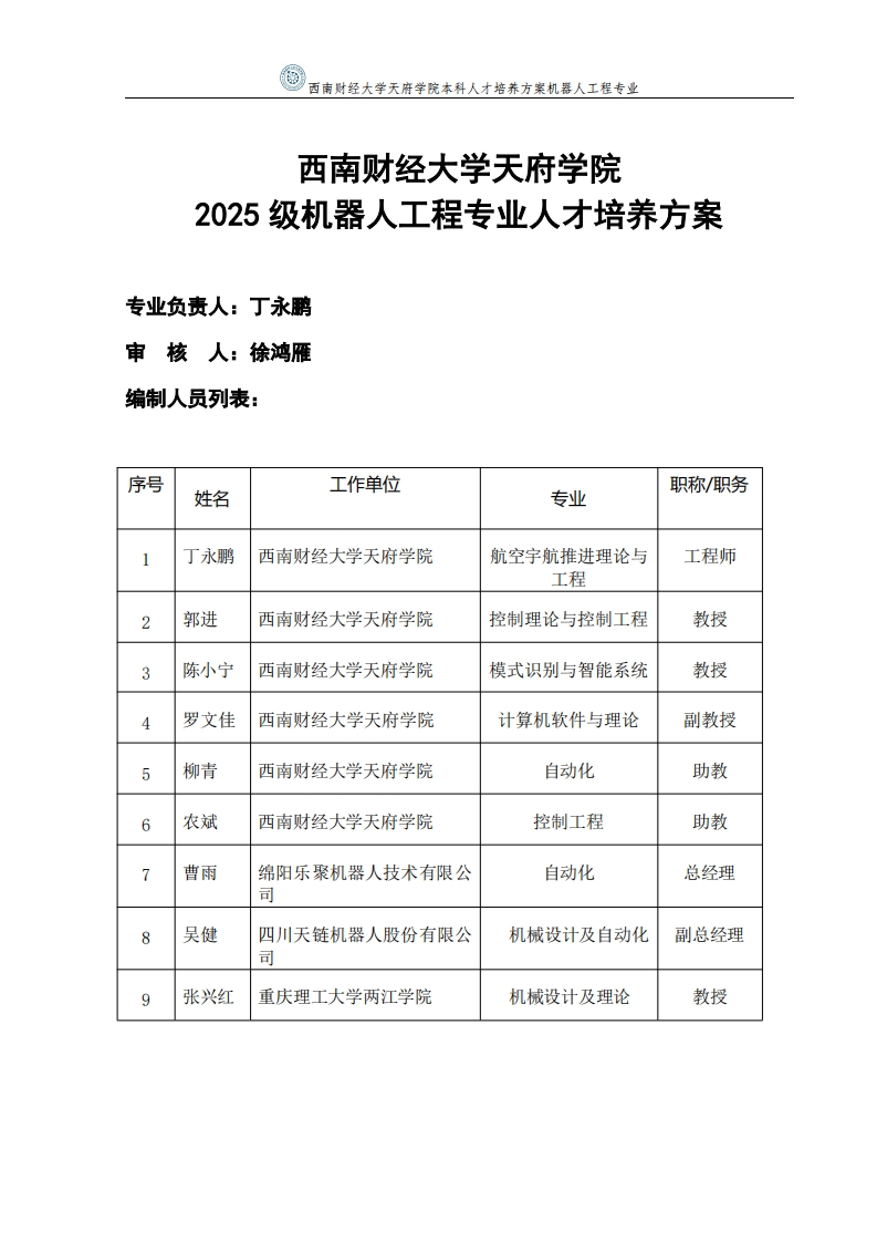 2025级机器人工程专业本科人才培养方案348072@abc6天前发布关注私信0.51MB21页0382025级机器人工程专业本科人才培养方案此内容为付费资源,请付费后查看¥13¥29黄金会员免费钻石会员免费立即购买您当前未登录!建议登陆后购买,可保存购买订单付费资源 第1页 / 共21页 第2页 / 共21页 第3页 / 共21页 试读已结束,还剩18页,您可下载完整版后进行离线阅读 THE END办公模板员工培训 文本预览 西南财经大学天府学院本科人才培养方案机器人工程专业。西南财经大学天雅学院6月西南财经大学天府学院机器人工程专业人才培养方案(2025级本科)版号:2025/1编制学院:智能科技学院审核人:徐鸿雁生效日期:2025年6月西南财经大学天府学院研究与发展处制二零二五年四月 查看更多 收起部分 喜欢就支持一下吧收藏