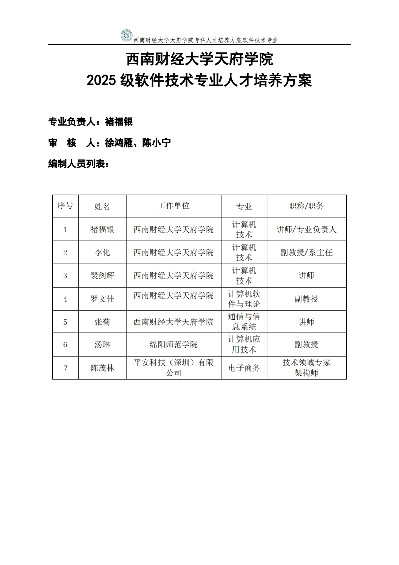 2025级软件技术专业专科专业人才培养方案348072@abc5天前发布关注私信0.64MB33页0462025级软件技术专业专科专业人才培养方案此内容为付费资源,请付费后查看¥13¥29黄金会员免费钻石会员免费立即购买您当前未登录!建议登陆后购买,可保存购买订单付费资源 第1页 / 共33页 第2页 / 共33页 第3页 / 共33页 试读已结束,还剩30页,您可下载完整版后进行离线阅读 THE END办公模板员工培训 文本预览 ®西南财经大学天府学院专科人才培养方案软件技术专业●西南财经大学天消学院/ANFU COLLEGEOF SWUEE西南财经大学天府学院软件技术专业人才培养方案(2025级专科)版号:2024版编制学院:智能科技学院审核人:徐鸿雁、陈小宁颁布日期:2025-03-01生效日期:2025-08-01西南财经大学天府学院研究与发展处制二零二五年三月 查看更多 收起部分 喜欢就支持一下吧收藏