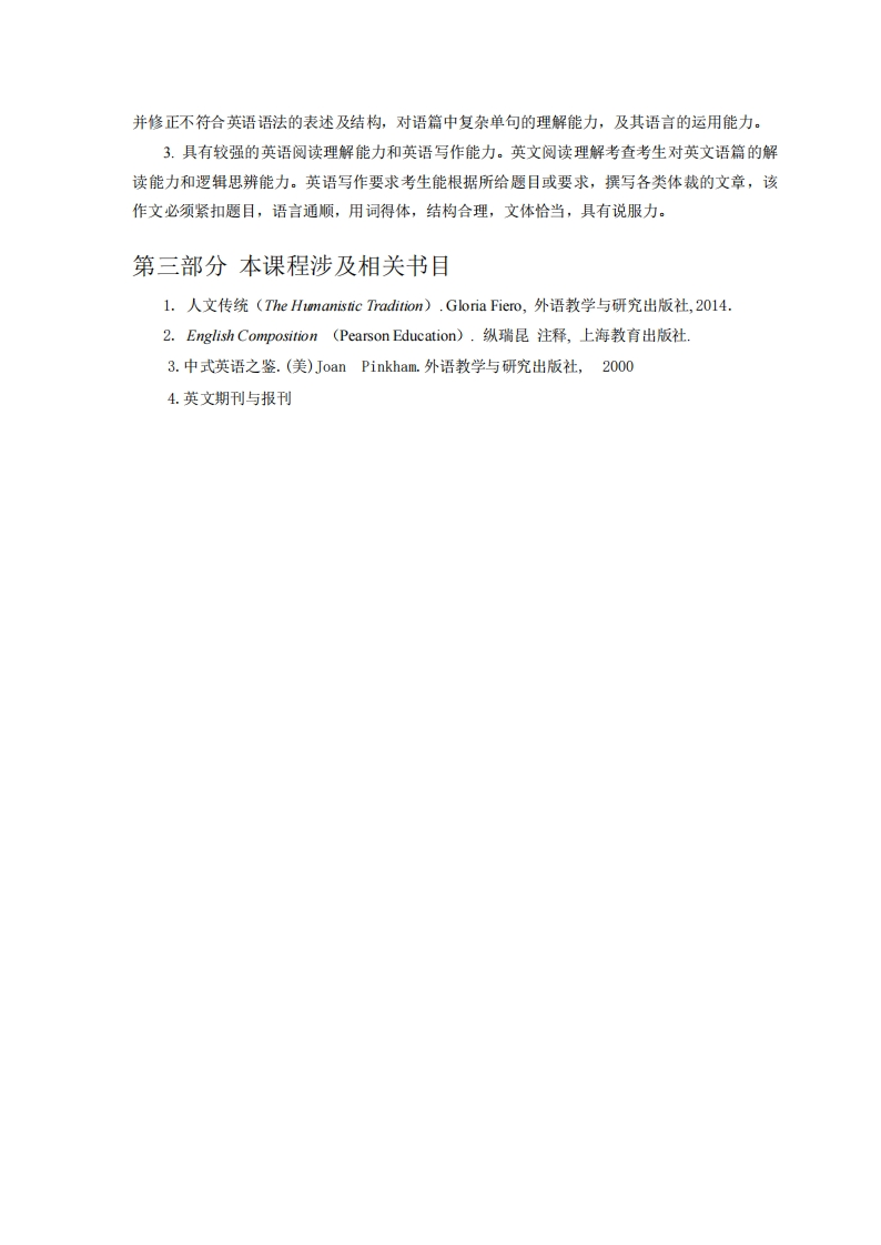 2026年硕士研究生招生考试初试科目大纲《翻译硕士(英语)》第一部分考试说明一、考试性质本考试是一种测试考生单项和综合英语语言能力的参照性水平考试。二、考试内容范围考试范围包括翻译硕士专业学位考生应具备的英语词汇量、语法知识、以及英语阅读与英语写作等方面的技能。三、评价目标《翻译硕士(英语)》是英语语言技能考试,是报考中国民用航空飞行学院翻译硕士(MT)专业考试科目之一,其目的是考察考生是否具备进行翻译硕士专业学位学习所要求的英语水平。四、考试形式与试卷结构本考试采取客观试题与主观试题相结合,单项技能测试与综合技能测试相结合的方法。各项试题的分布情况见“考试内容一览表”。本考试包括以下部分:词汇语法、阅读理解和英语写作。总分为100分。(一)词汇语法(30分)1.考试要求(1)词汇要求测试考生对词汇和词组的多种词性及词义搭配,易混词的区别及难词的认知能力。(2)语法要求测试考生能正确运用英语语法、结构、修辞等语言规范知识。2.题型本部分考试形式为选择题:共15个英文句子,每句中有一空缺或划线单词(短语),要求从句子下面A、B、C、D四个选择项中选择最佳答案。(二)阅读理解(30分)1.考试要求