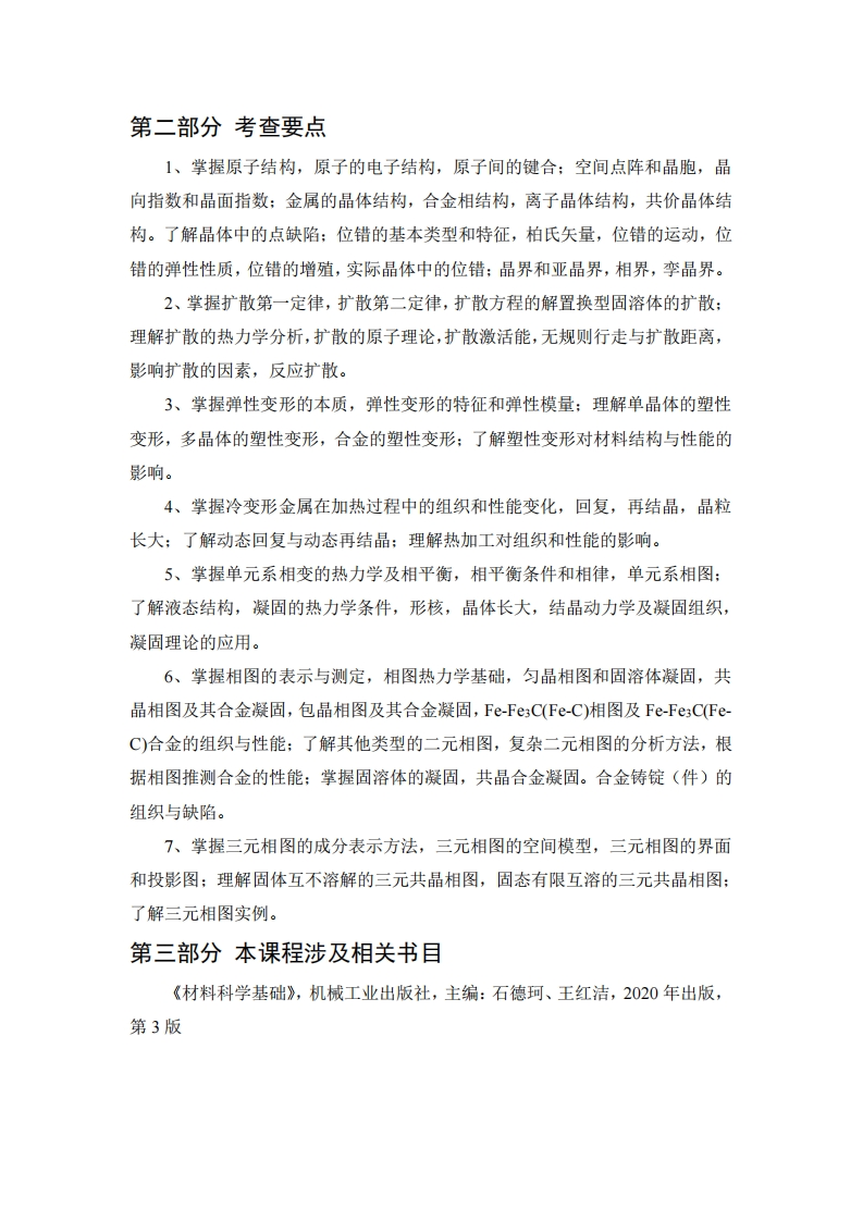 材料与化工专业硕士研究生入学考试初试大纲《材料科学基础》考试大纲第一部分考试说明一、考试性质《材料科学基础》考试是为招收材料与化工专业硕士研究生而实施的具有选拔功能的水平考试。二、考试内容《材料科学基础》考试内容包括:1、晶体学基础。2、固体中原子及分子的运动。3、材料的变形。4、回复与再结晶。5、单组元相图及纯晶体的凝固。6、二元系相图及合金的凝固。7、三元相图。三、评价目标要求考生系统掌握材料的化学成分-组织结构-加工工艺-性能之间关系的基本规律和基础理论,掌握课程的基本思想和方法,具有运用所学知识分析问题和解决问题的能力。四、考试形式与试卷结构(一)答卷方式:闭卷,笔试(二)答题时间:180分钟(三)总分150分(四)题型:选择题、填空题、名词解释题、简答题(五)是否使用计算器:否