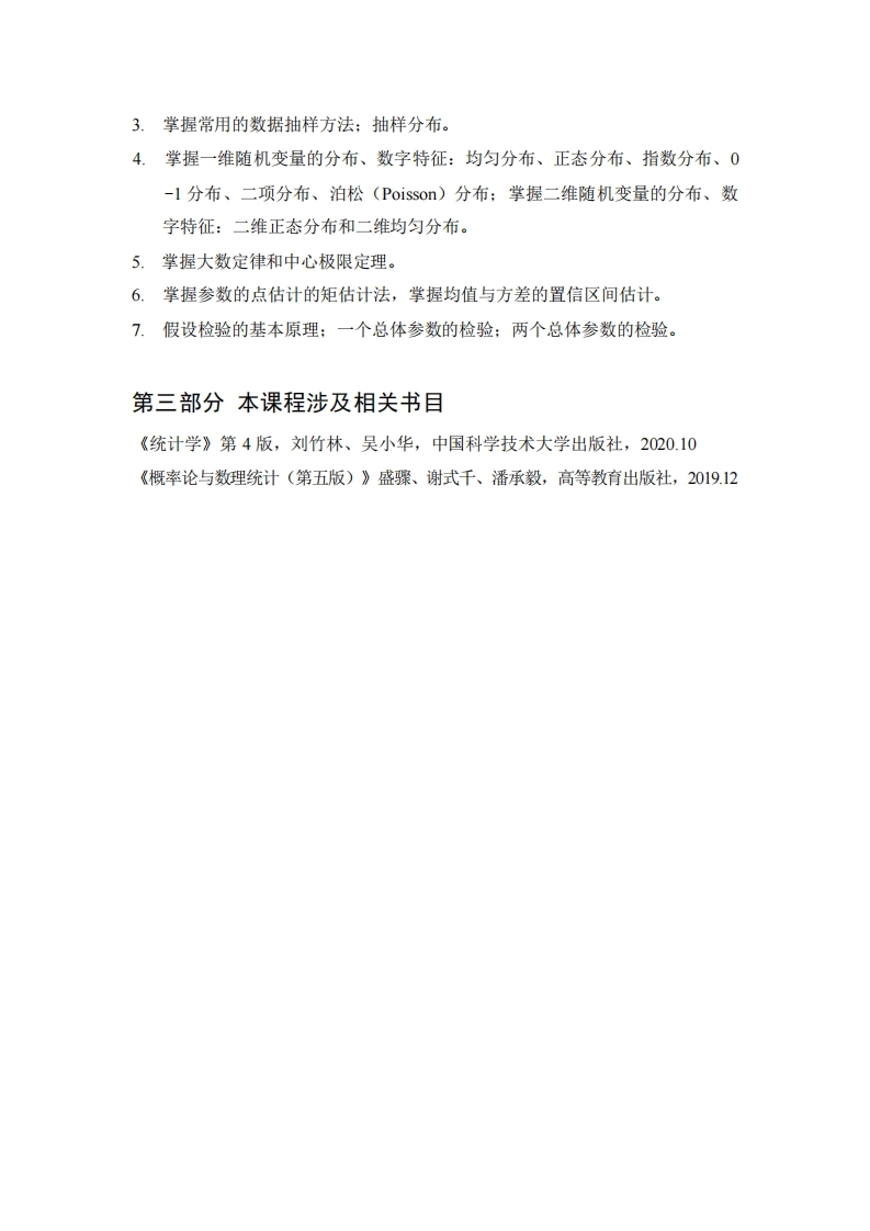 应用统计专业硕士研究生入学考试初试大纲《统计学》考试大纲第一部分考试说明一、考试性质《统计学》是应用统计硕士专业学位研究生入学考试的科目之一。《统计学》考试要求能反映统计学学科的特点,科学、公平、准确地测试考生的基本素质和综合能力,以便很好地选拔具有科研发展潜力的优秀人才进入硕士阶段学习,为国家培养掌握现代统计理论和方法,具有较强分析与解决实际问题能力的高层次的应用型的和复合型的统计专业人才。二、考试内容统计学的基本概念、随机变量及其分布、多维随机变量及其分布、随机变量的数字特征、大数定律及中心极限定理、样本及抽样分布、参数估计、假设检验。三、评价目标1、考生能够准确理解和掌握概率论和统计学的基本概念。2、能够熟练运用概率论的基本方法和技巧,包括概率计算、随机变量的分布计算、数字特征的计算等。3、能够运用所学知识解决实际问题,培养综合能力和逻辑思维能力,这包括但不限于参数估计、假设检验等应用题。四、考试形式与试卷结构本科目试卷满分为150分,考试时间为180分钟,答题方式为闭卷、笔试。可能包含的题型有:填空题、选择题、判断题、计算题、综合题。第二部分考查要点1.统计学的分科:统计数据的种类、来源和质量:统计学的基本概念:总体、样本和变量;统计数据的整理:分布集中趋势的测度;分布离散程度的测度:分布的偏态和峰度:统计表与统计图。2.概率计算公式,随机事件概率的计算。