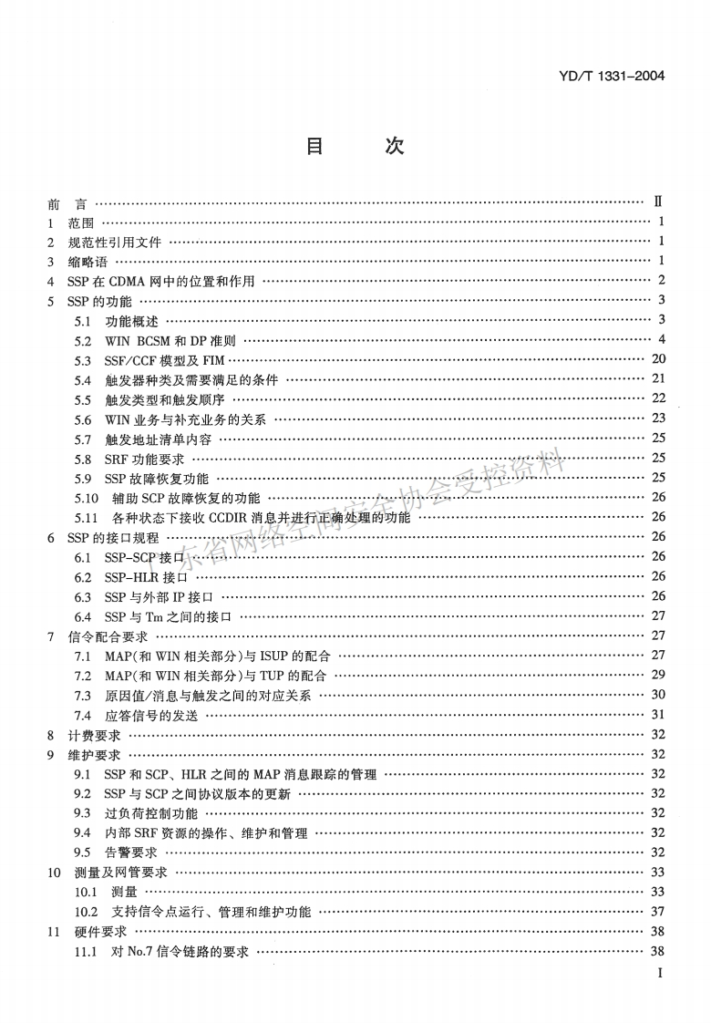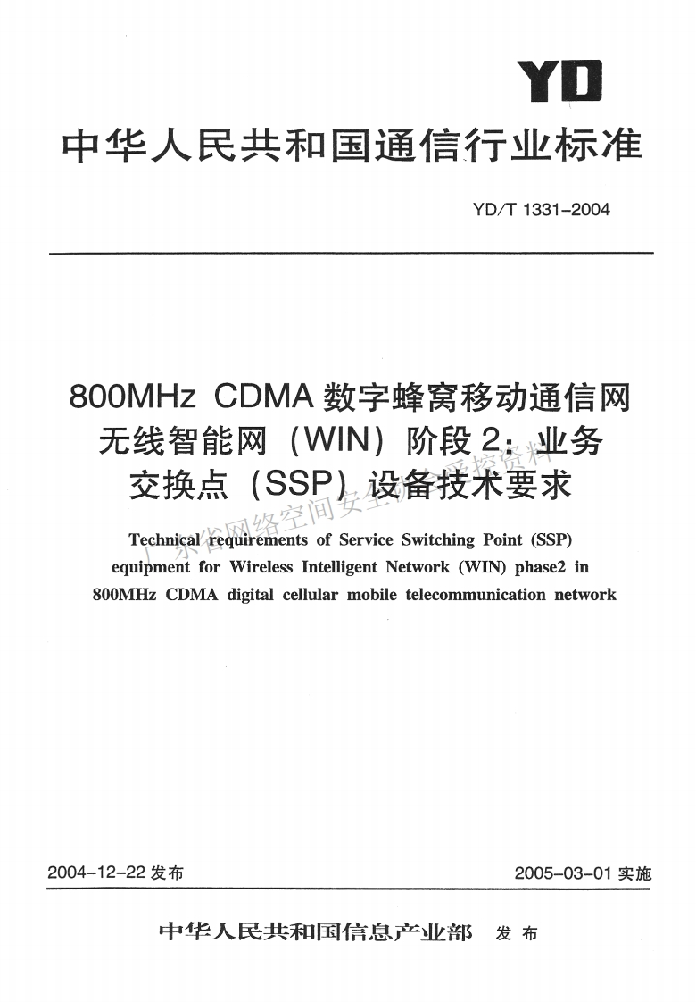 YD中华人民共和国通信行业标准YD/T1331-2004800 MHz CDMA数字蜂窝移动通信网无线智能网(WIN)阶段2:业务交换点(SSP)设备技术要求络空间Technical requirements of Service Switching Point (SSP)equipment for Wireless Intelligent Network (WIN)phase2 in800MHz CDMA digital cellular mobile telecommunication network2004-12-22发布2005-03-01实施中华人民共和国信息产业部发布