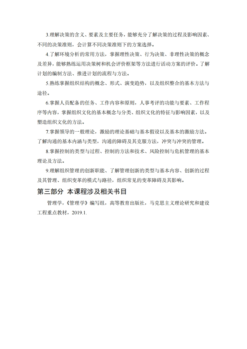 管理科学与工程专业硕士研究生入学考试初试大纲《管理学》考试大纲第一部分考试说明一、考试性质《管理学》是中国民用航空飞行学院硕士生入学初试考试科目之一。它的评价标准是:高等学校、民航机务部门的优秀本科毕业生能达到及格或及格以上水平,以保证被录取者具有管理学理论的基础知识和初步的应用能力。二、考试内容管理学的基本概念、管理的研究体系、研究对象、管理学的产生与发展、历史与演变、决策的概念与要素、决策过程与影响因素、环境分析的常用方法、理性决策与非理性决策、组织理论、领导的一般理论、激励与沟通、控制的类型与过程、控制的方法和技术、创新原理。三、评价目标要求考生较好地掌握管理的基本原理和管理的主要内容等基本概念、基本定律和基本方法,能够独立应用管理学的基本概念、基本理论和基本方法来分析和解决实际管理问题,具备一定的逻辑思维能力、综合分析能力。四、考试形式与试卷结构(一)答卷方式:闭卷,笔试。(二)答题时间:180分钟。(三)总分150分。第二部分考查要点1理解现代管理的主要内容、法约尔管理的五项职能,掌握管理过程中的基本方法。2.了解管理学相关理论的历史演变过程,掌握古典管理理论、现代管理论、当代管理理论中典型的研究问题、过程及研究结论。