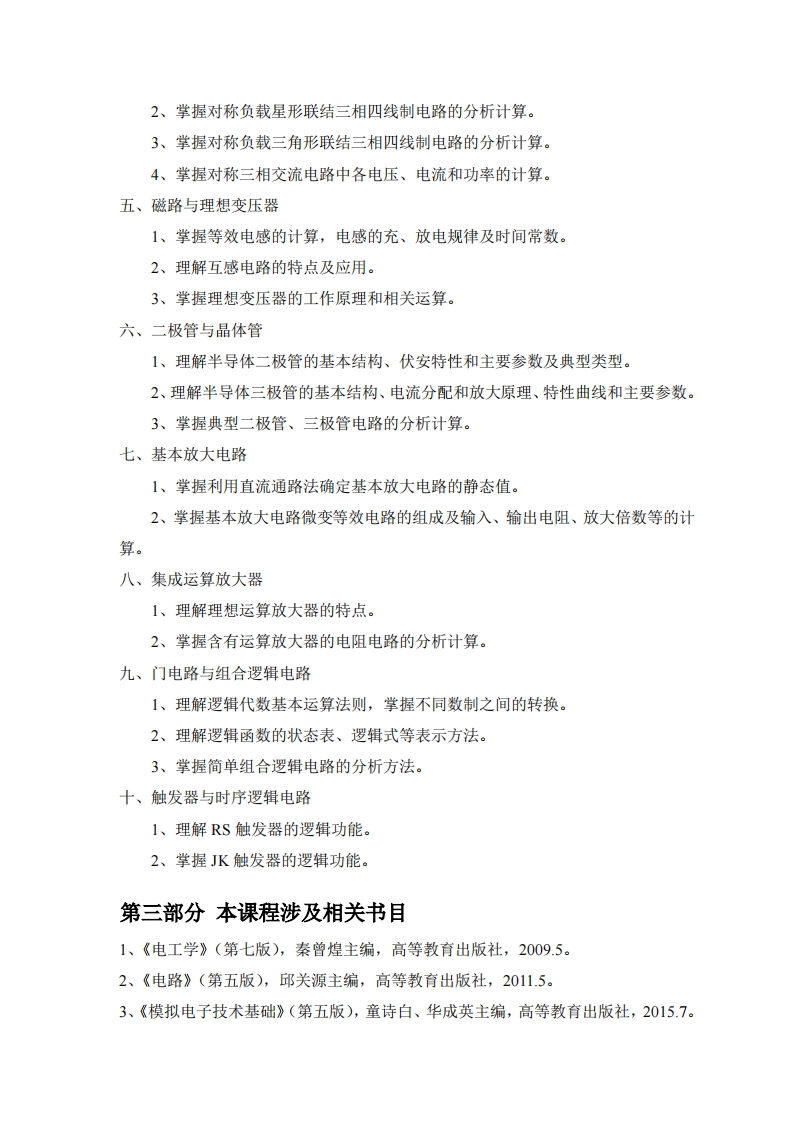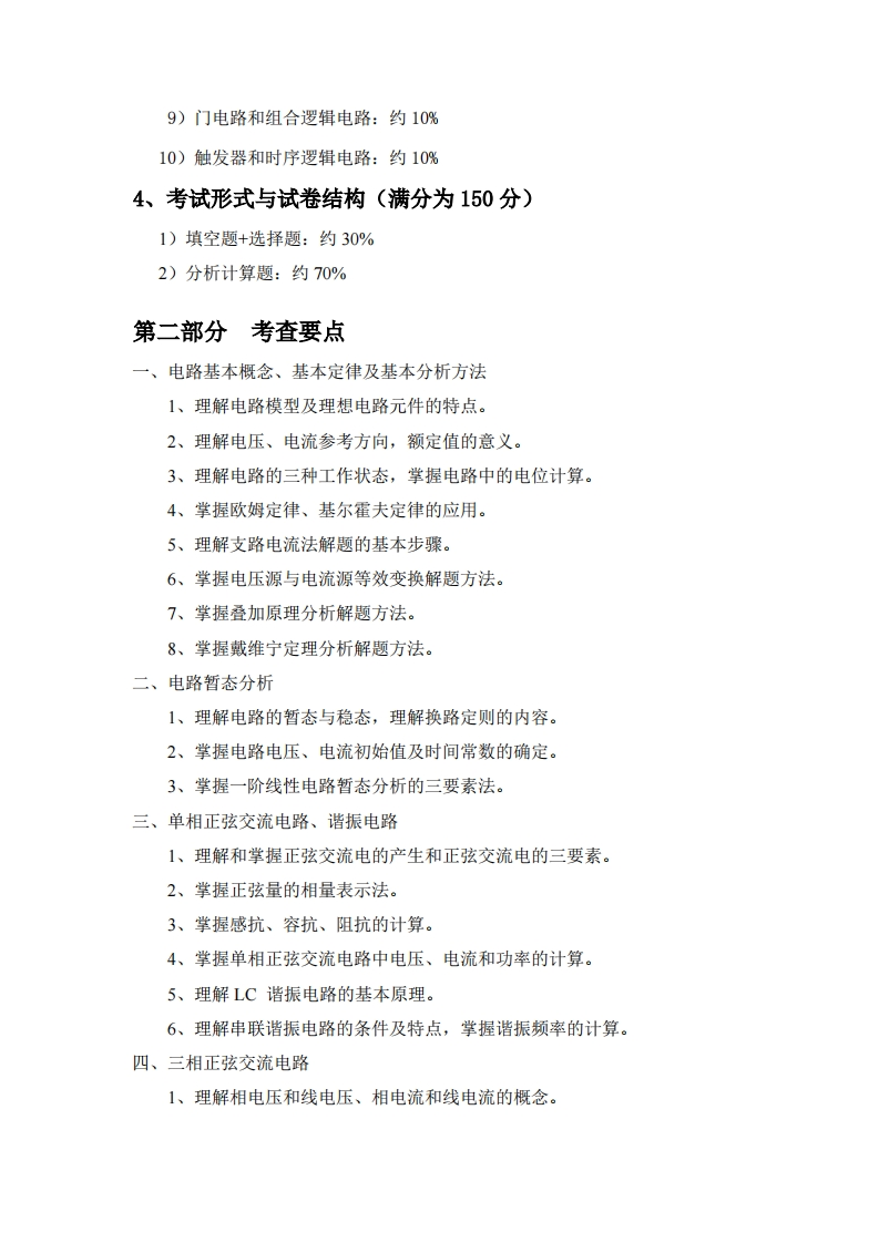 2022年硕士研究生招生考试初试科目大纲《电工电子学》第一部分考试说明一、考试性质《电工电子学》是中国民用航空飞行学院硕士生入学初试考试科目之一。它的评价标准是高等学校、科研院所的优秀本科毕业生能达到及格以上水平,以保证被录取者具有较为扎实的电路分析、模拟电路、数字电路的基础知识和能力。二、考试内容范围电路基本概念和基本定律,电路基本分析方法、电路暂态分析、相量表示法、正弦交流电路分析、对称三相交流电路分析、谐振电路特性、理想变压器电路分析、二极管和晶体管电路分析、晶体管基本放大电路分析、运算放大电路分析、门电路及组合逻辑电路分析、触发器等。三、评价目标要求考生较好地掌握电路相关基本概念、基本定律、基本分析方法等,能够应用电路基本概念、基本理论和基本方法来分析和计算从工程实际中简化出来的各种功能电路,具备一定的工程计算能力、综合分析能力。四、考试形式与试卷结构1、答卷方式:闭卷,笔试。2、答题时间:180分钟。3、各部分内容比例(满分为150分)1)电路基本概念、基本定律及基本分析方法:约15%:2)电路的暂态分析:约8%3)单相正弦交流电路、谐振电路:约10%4)三相正弦交流电路:约10%5)磁路与理想变压器:约5%6)二极管和晶体管:约12%7)基本放大电路:约10%8)集成运算放大器:约10%