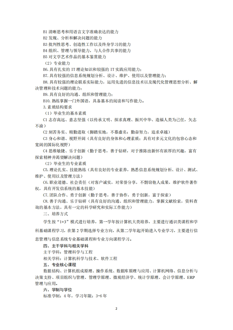 信息管理与信息系统专业培养方案专业代码:120102专业名称:信息管理与信息系统一、培养目标1.基本培养目标培养的学生身心健康、知识结构合理,有健全的人格、高尚的人文情怀和社会责任感,具有一定的批判思维与创新能力、科学研究能力、沟通交流能力、终身学习能力和组织管理能力,具有国际视野和团队合作精神。2.专业培养目标本专业培养德、智、体、美、劳全面发展的T创新型、复合型应用人才。学生不仅掌握管理学和经济学基本理论知识,而且掌握T知识和技能,具备信息系统项目的组织、管理和研发能力,为学生将来成长为信息系统项目经理、信息系统分析师、信息系统架构师以及信息主管等高级T人才奠定基础。学生能够在国家机关和各企事业单位运用所学知识和技能,解决管理和技术问题。可以从事信息系统项目的规划、分析、设计、测试、运行维护项目组织实施咨询及管理工作,以及信息资源开发和利用工作。二、毕业要求1.知识结构要求(1)毕业生应掌握的基本知识A1历史、哲学、文学、艺术等领域的基本知识(培养学生具有正确的历史观、世界观、人生观、价值观、审美观)。A2社会科学学科研究方法的基本知识(让学生掌握社会科学的基本知识,了解基本研究方法,具有人文情怀和社会责任感)A3数理与逻辑分析以及物理学的基础知识(让学生掌握数理与逻辑分析、大学物理的基本知识)A4现代信息技术的基本知识(让学生掌握现代网络技术、通信技术和信息处理技术等的基本知识)A5生态环境、生命科学、经济管理等方面的基本知识(让学生掌握生态环境与人类命运、科技创新与社会发展、农业发展与政策法规、传统文化与世界文明等方面的基本知识)(2)本科生应掌握的专业知识A6.计算机科学与技术的基础理论和方法(让学生掌握计算机基础理论和基本技能、计算机软硬件的基础理论、信息系统开发的基本方法):A7.计算机组成、操作系统、计算机网络、数据库等基础知识(让学生掌握计算机软件开发的软、硬件基础):A8.信息系统分析、设计、测试的方法和主流技术(让学生掌握信息系统分析、设计、测试的基本知识和基本方法)A9.管理学原理、微观经济学、会计学原理(让学生掌握现代管理学和经济学理论知识和基本方法):A10.面向对象系统分析与设计、信息系统与决策支持、人工智能(让学生掌握信息系统规划分析、设计、维护、使用以及管理方法)。2.能力结构要求(1)基本能力1