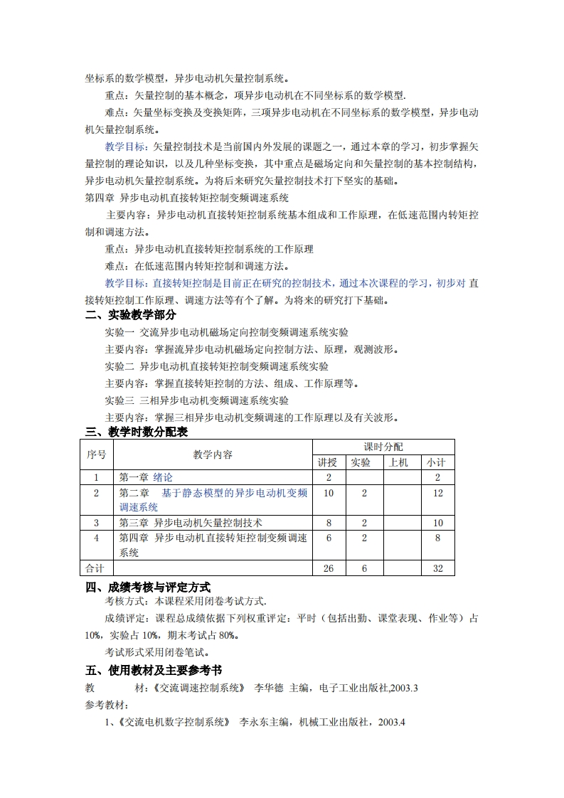 《交流电机控制技术》教学大纲课程编码:330571课程英文名称:AC Motor Control Technology学时数:32学分:2适用专业:自动化教学大纲说明一、课程的性质、教学目的与任务课程性质:《交流电机控制技术》是自动化专业的专业必修课。教学目的与任务:通过本课程的学习,培养学生对交流电机的初步认识及有关交流电机的一些控制、调速技术,其中重点掌握基于静态控制方式的异步电动机变频调速系统:异步电动机数学模型、矢量坐标变换、矢量控制系统构成以及异步电动机直接转矩控制系统的基本理论和基本组成,为学生从事有关行业的工作打下基础。二、课程教学的基本要求本课程主要采用板书的形式讲授,通过本课程各个教学环节的学习,重点培养学生对交流电机控制及调速技术的掌握,培养学生的自学能力、动手能力、分析问题、解决问题的能力,培养学习设计、计算以及利用已掌握的知识分析问题的能力。三、本课程与相关课程的关系先修课程为:自动控制系统、模拟电子技术、高等数学、电路等。四、新大纲的改革说明教学大纲一、理论教学部分第一章绪论主要内容:交流电动机调速技术的发展和现状,现代交流调速系统的类型,现代交流调速系统今后的发展趋势和动向·第二章基于静态模型的异步电动机变频调速系统主要内容:基于静态模型的异步电动机变频调速系统控制原理及其机械特性,交流调速的脉宽调制(PW)控制技术,恒压频比控制、转差频率控制以及电流正弦PM控制的异步电动机变频调速系统。重点:恒压频比控制、转差频率控制和电流正弦P控制异步电动机变频调速系统。难点:恒压频比控制、转差频率控制和电流正弦P控制异步电动机变频调速系统。教学目标:通过本章的学习,对异步电动机变频调速系统控制原理及机械特性以及各种调速控制系统,对交流调速有更深的理解。第三章异步电动机矢量控制技术主要内容:矢量控制的基本概念,矢量坐标变换及变换矩阵,三项异步电动机在不同