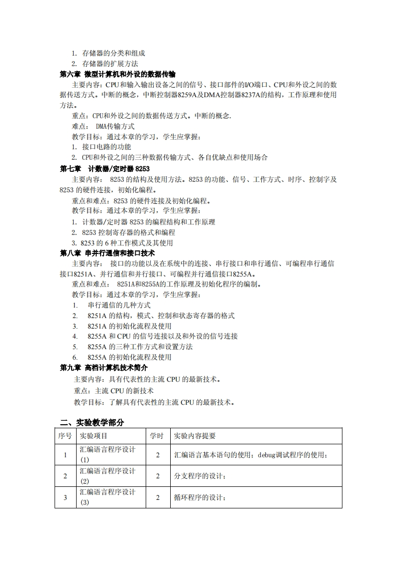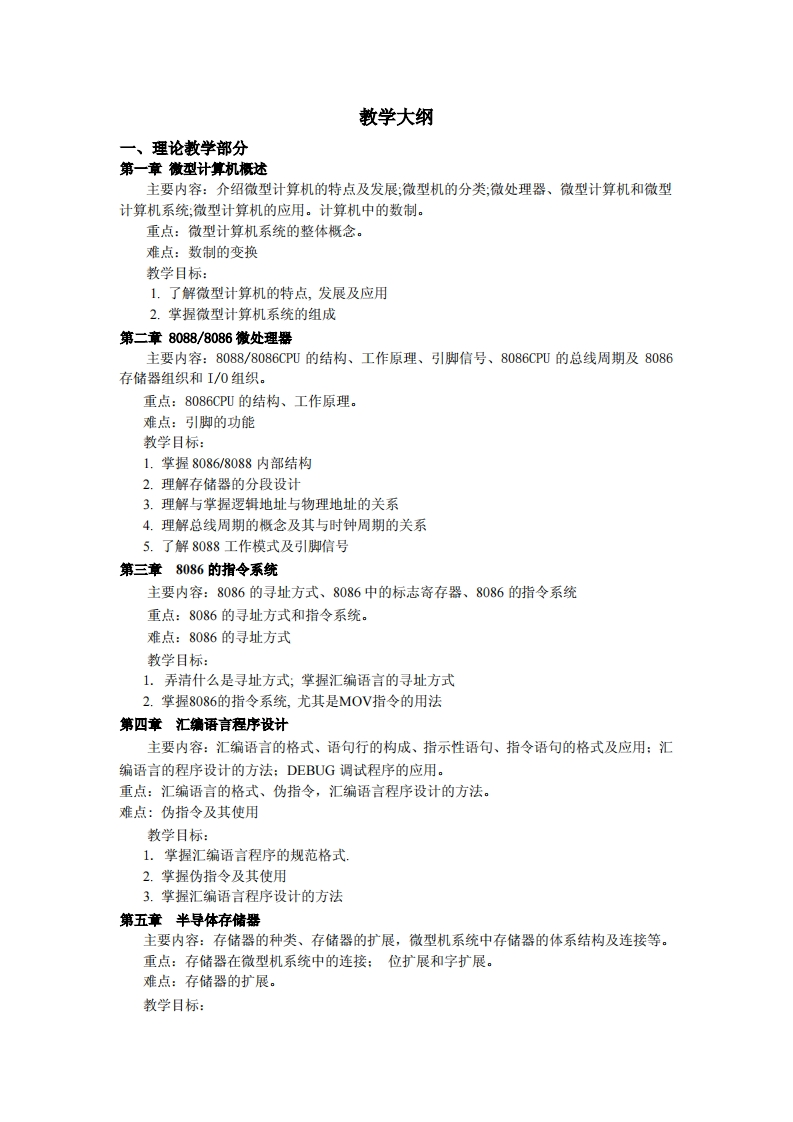 《微机原理及应用》教学大纲课程编码:242221课程英文名称:Principle and Applications ofMicrocomputer学时数:64学分:4适用专业:自动化教学大纲说明一、课程的性质、教学目的与任务本课程是自动化专业的一门重要的专业基础课程,是学生学习掌握计算机硬件的入门课。本课程的目的是帮助学生掌握微型计算机的硬件组成及使用:学会运用汇编语言进行程序设计:具备初步的开发软、硬件的能力,为学习其它专业知识及从事工程技术工作和科学研究工作打下初步基础。本课程的任务是使自动化专业的学生获得关于计算机体系结构的基本概念,汇编语言程序设计方法及一些常用的微机接口芯片的应用方法及技能。二、课程教学的基本要求课程采用以多媒体课件教学为主、以黑板板书为辅的教学方式。注重理论联系实际,采用启发式教学方法,培养学生分析问题、解决问题和创新实践能力。在课堂讲授的基础上,配合一定量的作业来组织教学,,作业成绩作为期末考核的平时成绩的一部分。通过对本课程的学习,学生应达到以下的要求:1.了解微型计算机的基本结构及工作原理:2.熟练掌握8086/8088的指令系统,能进行基本的汇编语言程序设计3.了解CPU和外设之间的数据传送方式4.对一些常用的微机接口芯片、可进行初始化编程5.受到必要的实验技能的训练三、本课程与相关课程的关系该课程是一门计算机基础课程,包含了计算机软、硬件基础知识。是继续学习计算机其它课程的基础课。本课程的先修课程为《电路理论》、《数字电子技术》,《模拟电子技术》等。后继课为《单片机及接口技术》,《嵌入式系统开发技术》等,并与其他计算机控制技术课程密切相关。四、新大纲的改革说明由于《2006年自动化专业培养方案》发生了变化,本课程的理论课学时由原来的56学时改为48学时。相应的教学内容进行了删改。教学大纲的编写也有了新的要求,本大纲按照新的教学大纲格式重新编写。突出了重点,难点。