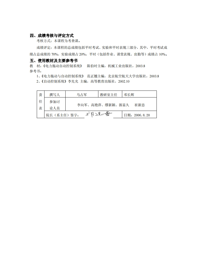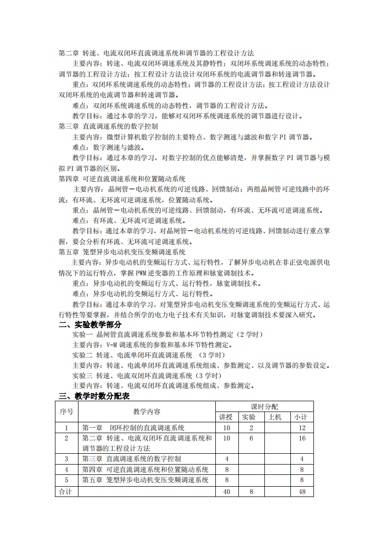 《自动控制系统》教学大纲课程编码:330521课程英文名称:Automatic Control System学时数:48学分:3适用专业:自动化教学大纲说明一、课程的性质、教学目的与任务课程性质:《自动控制系统》是自动化专业的必修课。教学目的与任务:通过本课程的学习,使学生掌握闭环控制直流调速系统的组成、特性、调速方法等:转速、电流双闭环直流调速系统和调节器的工程设计的组成、静特性,调节器的设计方法等:可逆直流调速系统和位置随动系统的概念、组成、静特性等。自动控制系统实验是本课程的重要实践环节,使学生掌握自动控制系统原理和方法,初步掌握对系统分析方法的能力。二、课程教学的基本要求通过本课程的学习,使学生能够对电力拖动自动控制系统-运动控制系统有总体的理解和掌握,激发学生的积极性:在授课过程中主要采用电子教案的形式,对于重点内容结合板书进行讲解,学生通过本课程的学习应达到以下要求:对理论课教学内容要求学生具有掌握用系统的观点如何分析电力拖动自动控制系统。具备设计电力拖动自动控制系统的能力以及正确运用理论解决实际问题。三、本课程与相关课程的关系先修课程为:模拟电子技术、数字电子电路、自动控制原理、电路、电机与拖动原理等。后续课程为:计算机控制技术、电力电子技术等。四、新大纲的改革说明教学大纲一、理论教学部分第一章闭环控制的直流调速系统主要内容:直流调速系统用的可控直流电源,晶闸管-电动机系统的主要问题:直流脉宽调速系统的主要问题,反馈控制闭环调速系统的稳态、动态分析与设计:积分、比例积分控制规律:无静差调速系统:电压反馈电流补偿控制的调速系统。重点:反馈控制闭环调速系统的稳态、动态分析,积分、比例积分控制规律:无静差调速系统:电压反馈电流补偿控制的调速系统。难点:反馈控制闭环调速系统的动态分析,无静差调速系统:电压反馈电流补偿控制的调速系统。教学目标:引导学生对直流调速有个初步的认识,并对反馈控制闭环调速系统的稳态、动态分析与设计以及无静差调速系统、电压反馈电流补偿控制的调速系统等重点介绍。了解直流调速与交流调速的不同。