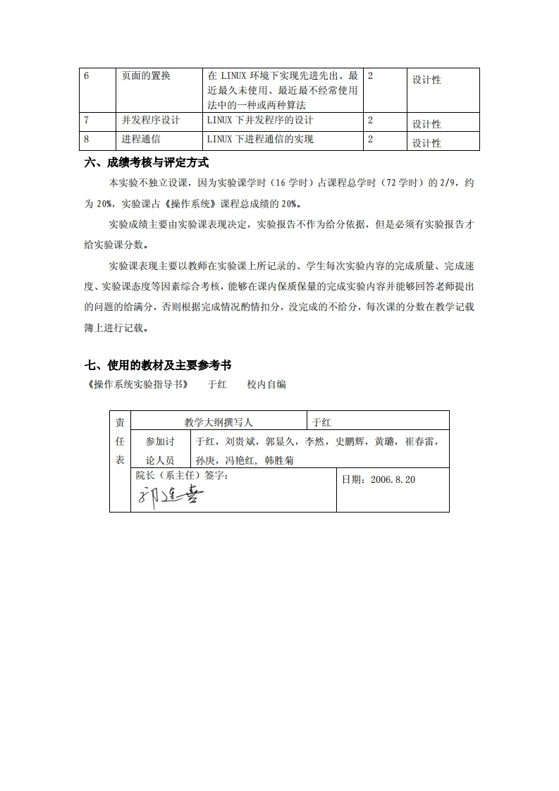 《操作系统》实验教学大纲课程编码:241421课程英文名称:Operating System学时数:72/16学分:4.5适用专业:计算机科学与技术教学大纲说明一、制订本课程实验大纲的依据:1.大连水产学院计算机科学与技术专业2006版《本科教学计划》2.《操作系统》课程2006版教学大纲3.要求学生掌握操作系统的基本原理和进程调度、内存分配、作业管理等模块的基本算法。二、本课程实验教学的作用:本课程实验教学是为了配合《操作系统》课程而设置的。旨在使学生在掌握了一定的理论知识的基础上,通过实际动手操作,加深对该门课程的了解,使学生对知识有一个感性认识,便于学生对抽象算法的形象化理解。三、本课程实验教学目的及学生能力标准:使学生在掌握了理论知识的基础上,通过实验课加深对理论内容的了解,要求学生能熟悉对LINUX系统中大部分命令的使用,为LNUX系统下的程序调试打下基础:掌握LNUX下的C程序设计、编辑、编译、连接、执行:掌握银行家算法、作业调度的典型算法、存储器管理的常用算法的编程实现。四、教学形式:每次课前教师对实验内容进行讲解,然后学生人手一机自己完成实验内容,教师根据学生的实验情况对学生进行个别辅导,帮助学生解决实验中出现的问题。五、实验项目、内容、学时分配及实验类型(一)必开实验序号实验项目实验内容提要学时实验类型1LINUX基本命令LINUX常用命令的使用2验证性2VⅥ编辑软件LINUX下的全屏幕编辑软件VT的使2验证性用,LINUX下C程序的编辑、编译、连接、执行。3银行家算法的实银行家算法以及安全性算法的实现2设计性现4作业调度算法在LINUX环境下实现短作业优先、2设计性先到先服务、高响应比优先算法中的一种或两种动态分区动态分区的分配与回收算法的实现设计性