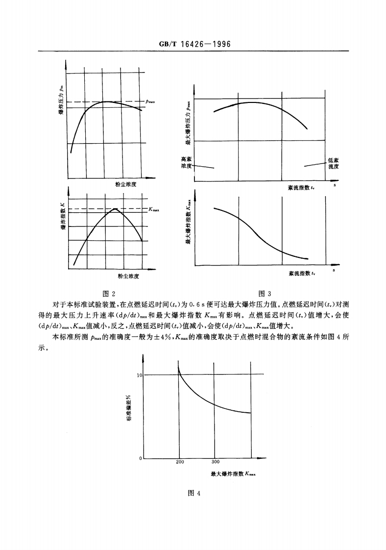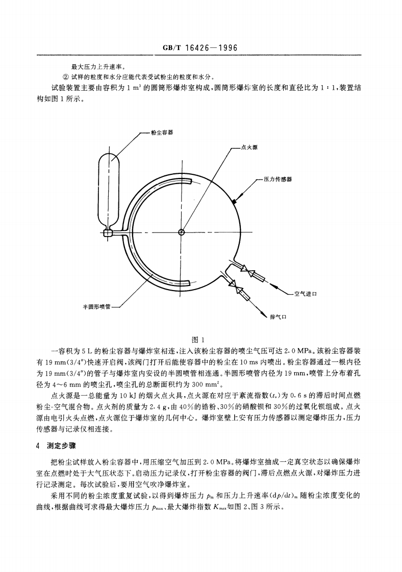 中华人民共和国国家标准粉尘云最大爆炸压力和最大压力上升速率测定方法GB/T16426-1996Determination for maximum explosion pressure andmaximum rate of pressure rise of dust cloud本标准等效采用国际组织IS0/DIS6184/1《爆炸预防系统第1部分:空气中可燃粉尘爆炸指数测定方法》。1主题内容与适用范围本标准规定了可燃粉尘云最大燥炸压力和最大压力上升速率测定用试验装置、测定步骤、其他替代测定方法和测定报告。本标准适用于一般工业粉尘。本标准不适用炸药或具有爆炸性质的物质。2术语2.1爆炸压力(pm)explosion pressure(pm)在爆炸过程中达到的相对于着火时容器中压力的最大过压值。2.2最大爆炸压力(pmx)maximum explosion pressure(pmr)在多种反应物浓度下,通过一系列试验确定的爆炸压力的最大值。2.3压力上升速率〔(dp/dt)m)rate of pressure rise〔(dp/dt)mJ在爆炸过程中测得的爆炸压力随时间变化曲线的最大斜率。2.4最大压力上升速率〔(dp/dt)ax]maximum rate of pressure rise〔(dp/dt)max)在多种反应物浓度下,通过一系列试验确定的压力上升速率(dp/dt)的最大值。2.5爆炸指数(K)explosion index(Km)由容器的容积V和燥炸时压力上升速率(d/d)按下列公式所确定的常数:Km=(dp/dt)m x Vi/s2.6最大爆炸指数(Kmmx)maximum explosion index(Kx)由多种反应物浓度范围内的试验测得的爆炸指数Km的最大值。2.7紊流指数(t,)(点燃延迟时间)turbulence index(tv)(ignition delay)根据试验装置中粉尘开始扩散与点火源触发之间的时间间隔所确定的试验参数,它表征在点燃瞬间经常出现的紊流的程度。3试验装置本标准所述试验装置适用于测定粒度小于75m、水分低于10%的可燃粉尘的最大爆炸压力和最大压力上升速率。注:①如果粒度较大或水分较高的粉尘能在爆炸室中有效地扩散,则可用该装置测定这种粉尘的最大燥炸压力和国家技术监督局1996-06-04批准1997-04-01实施