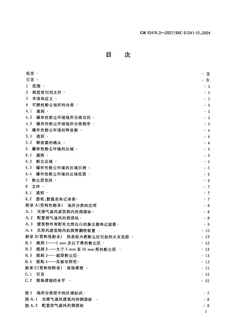 1CS29.260.20K35B中华人民共和国国家标准GB12476.3-2007/IEC61241-10:2004可燃性粉尘环境用电气设备第3部分:存在或可能存在可燃性粉尘的场所分类Electrical apparatus for use in the presence of combustible dust-Part 3:Classification of areas where combustible dusts are or may be present(IEC61241-10:2004,IDT)2007-01-23发布2007-09-01实施中华人民共和国国家质量监督检验检疫总局中国国家标准化管理委员会发布