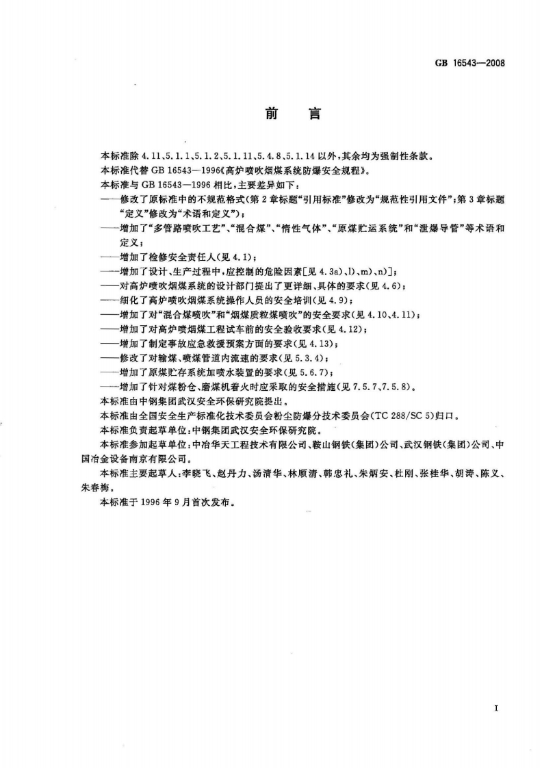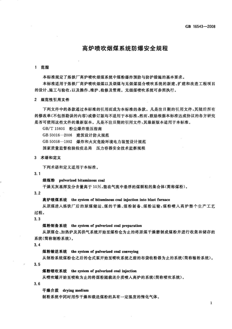 ICS13.230C67中华人民共和国国家标准GB16543-2008代替GB16543一1996高炉喷吹烟煤系统防爆安全规程Safety regulations for explosion prevention and protectionon bituminous coal injection system into blast furnace2008-04-22发布2008-11-01实施中华人民共和国国家质量监督检验检疫总局中国国家标准化管理委员会发布