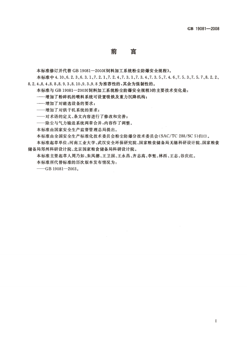 gb19081-2008饲料加工系统粉尘防爆安全规程348072@abc4天前发布关注私信4.26MB9页037gb19081-2008饲料加工系统粉尘防爆安全规程此内容为付费资源,请付费后查看¥13¥19黄金会员免费钻石会员免费立即购买您当前未登录!建议登陆后购买,可保存购买订单付费资源 第1页 / 共9页 第2页 / 共9页 第3页 / 共9页 试读已结束,还剩6页,您可下载完整版后进行离线阅读 THE END标准规范 文本预览 ICs13.230C67GB中华人民共和国国家标准GB19081-2008代替GB19081一2003饲料加工系统粉尘防爆安全规程Safety regulations for dust explosion prevention in feedprocessing system2008-12-11发布2009-10-01实施中华人民共和国国家质量监督检验检疫总局中国国家标准化管理委员会发布 查看更多 收起部分 喜欢就支持一下吧收藏