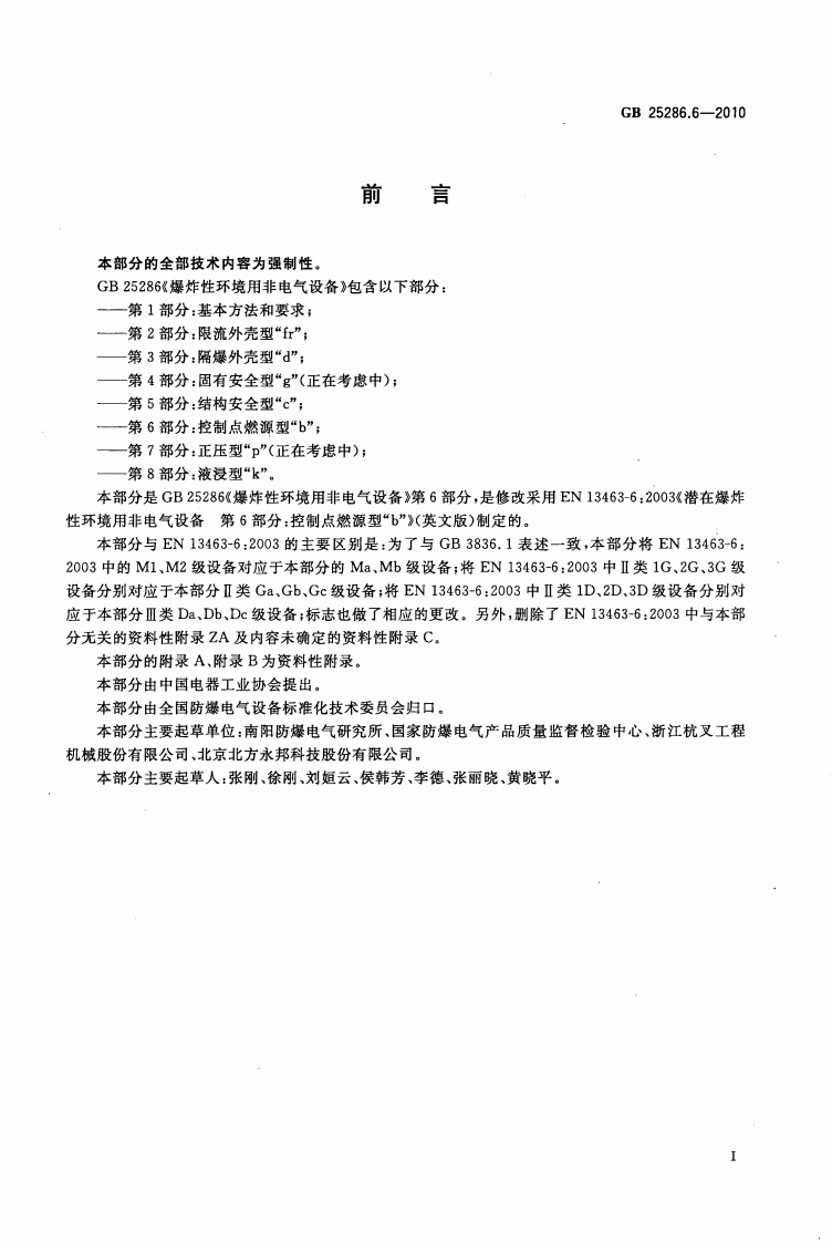 ICS29.260.20K35中华人民共和国国家标准GB25286.6-2010爆炸性环境用非电气设备第6部分:控制点燃源型“b”Non-electrical equipment for explosive atmospheres-Part 6:Protection by control of ignition source "b"2010-11-10发布2011-09-01实施中华人民共和国国家质量监督检验检疫总局中国国家标准化管理委员会发布纹码防彷