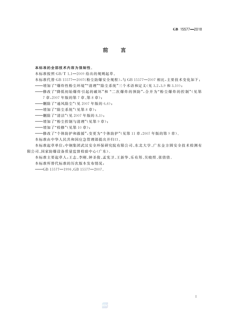 国标15577-2018348072@abc4天前发布关注私信4.97MB9页028国标15577-2018此内容为付费资源,请付费后查看¥13¥19黄金会员免费钻石会员免费立即购买您当前未登录!建议登陆后购买,可保存购买订单付费资源 第1页 / 共9页 第2页 / 共9页 第3页 / 共9页 试读已结束,还剩6页,您可下载完整版后进行离线阅读 THE END标准规范 文本预览 1CS13.230C67GB中华人民共和国国家标准GB15577-2018代替GB155772007粉尘防爆安全规程Safety regulations for dust explosion prevention and protection2018-11-19发布2019-06-01实施国家市场监督管理总局中国国家标准化管理委员会发布 查看更多 收起部分 喜欢就支持一下吧收藏